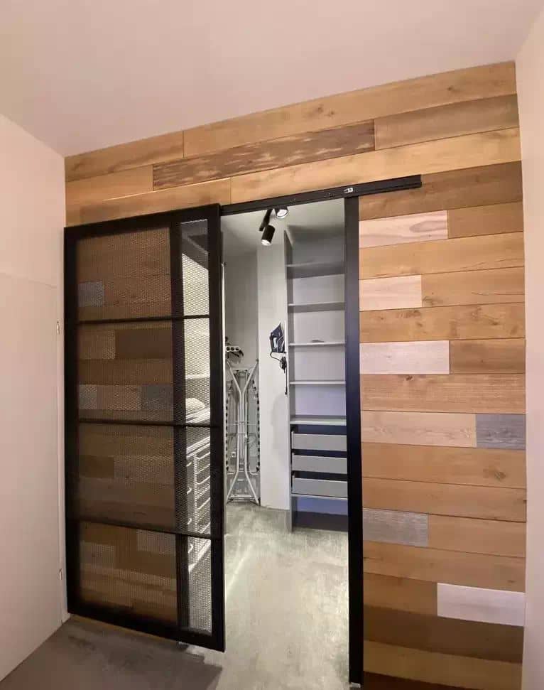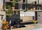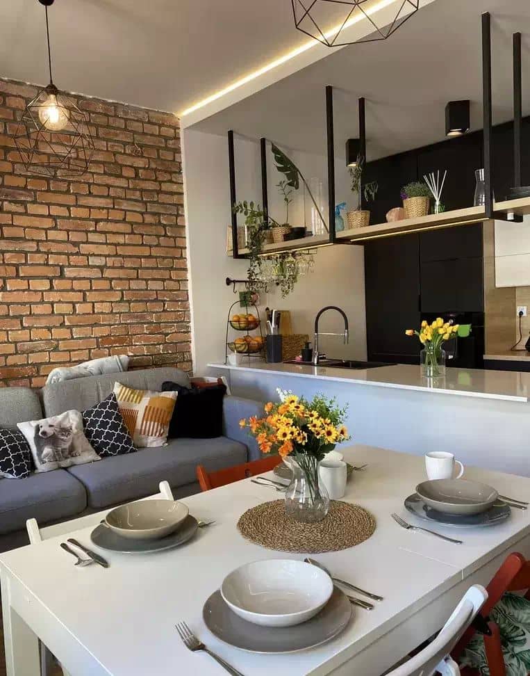 Wnętrze urządzone w spójnym stylu loftowo-skandynawskim, z wykorzystaniem naturalnych materiałów cegły i drewna.