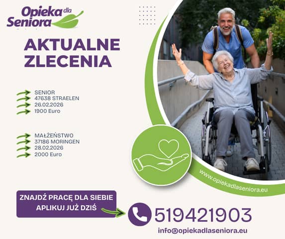 Oferta do Seniora 47638 Straelen / Nadrenia Północna-Westfalia Od 26.02.2026 Na 6 tygodni do 1900 EURO + opłacony przejazd Wymagania: komunikatywna znajomość języka niemieckiego + prawo