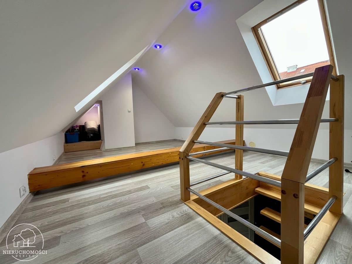Na podłogach panele oraz kafle, stolarka okienna PCV (okno balkonowe) oraz drewniana (okna dachowe).