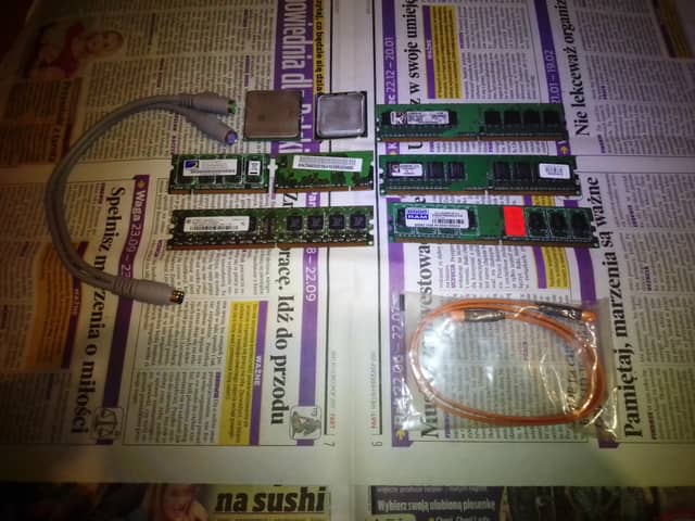 Zestaw podzespołów komputerowych. W zestawie nowy kabel sata, pamięć ddr2 do komputera stacjonarnego Kingston KVR667D2N5K2/1G 1GB, KVR667D2N5/512 512 MB, Goodram GR667D264L5/1G 1GB, Infineon HYS64T128020HU-3.7-A 1GB PC4200, pamięc ddr2 do laptopa Twinmos pc2-4200 8D22JJ-HX 512 mb 533 MHz i Infineon HYS64T32000HDL-3.7-A 1Rx16 PC2-4200S-444-11- C0 256 mb 533 Mhz, procesor Amd Sempron SDA2800AIO3BX 2800+ s.754, procesor Intel Pentium Dual Core SLA3J Malay 1.60 GHz s.775 - podzespoły sprawne oprócz rozdzielacza gniazda PS/2 dla klawiatury / myszki. Umożliwia podłączenia do jednego gniazda PS/2 dwóch urządzeń np. klawiatury i myszki (u mnie nie działał) i trzeba go traktować jako uszkodzony. 40 zł.