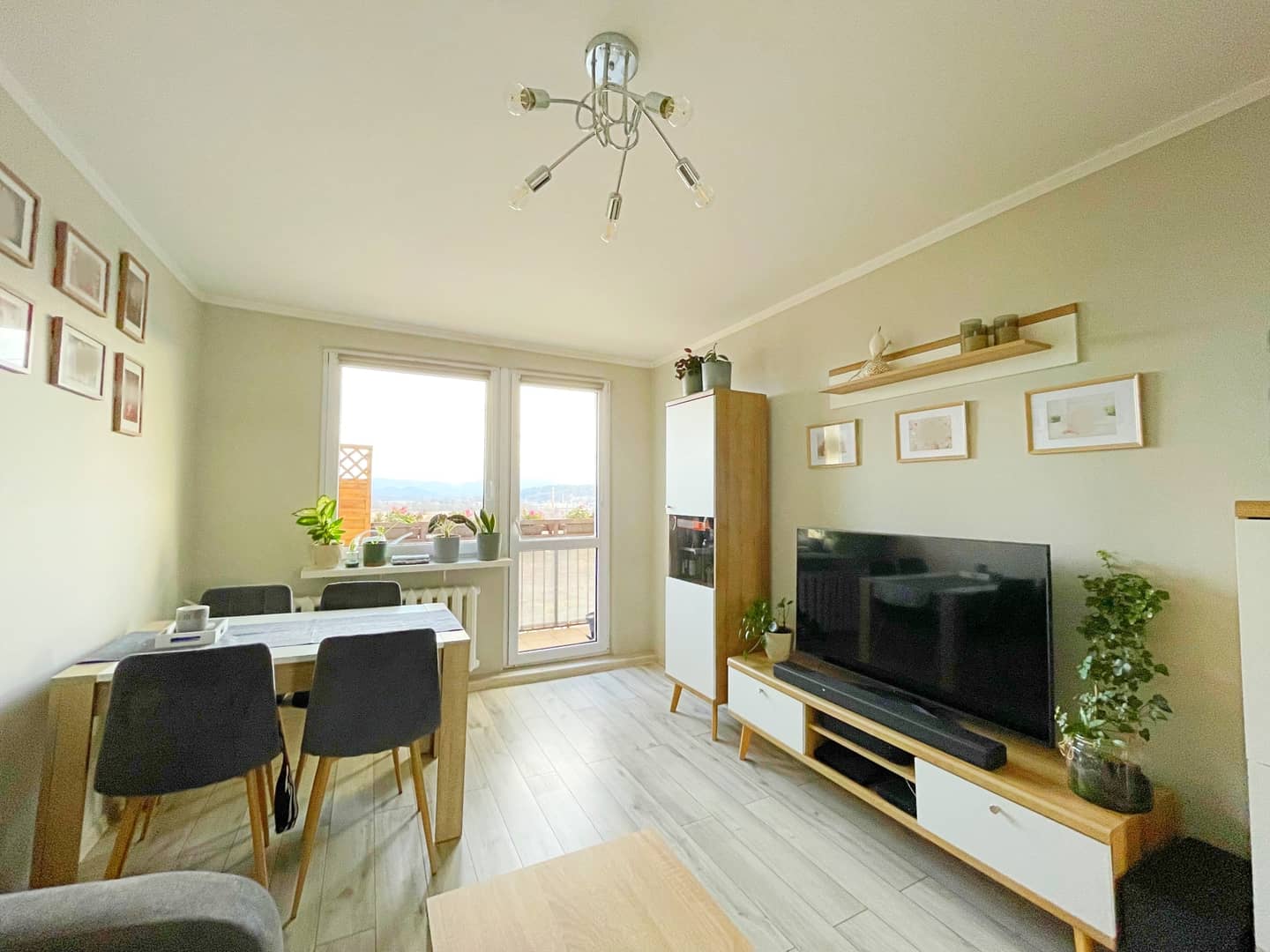 - słoneczny salon z wyjściem na balkon z nieprawdopodobnym widokiem na góry