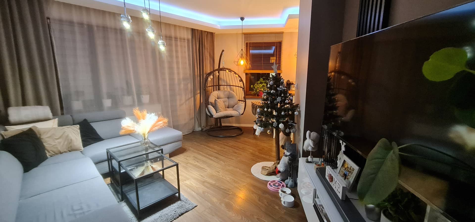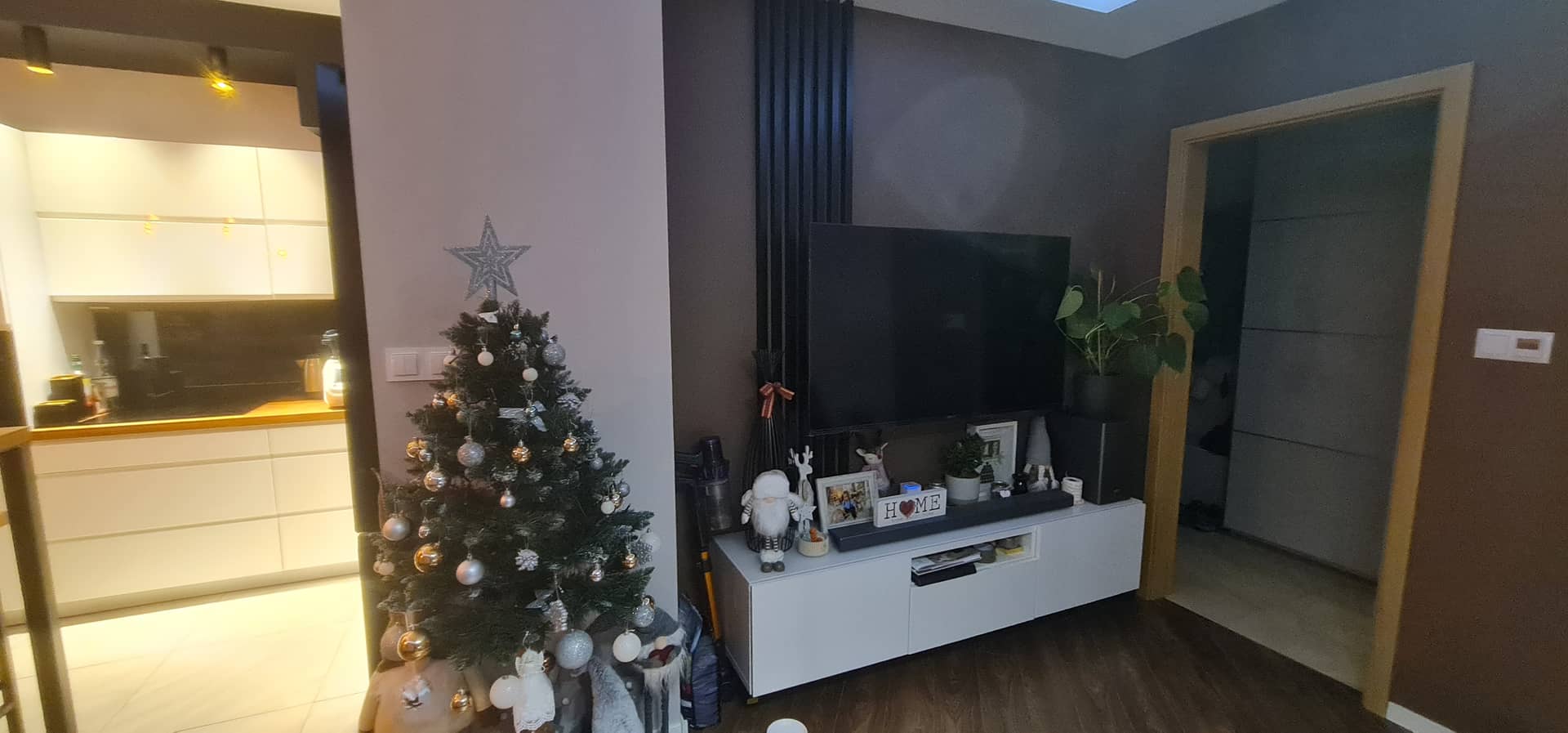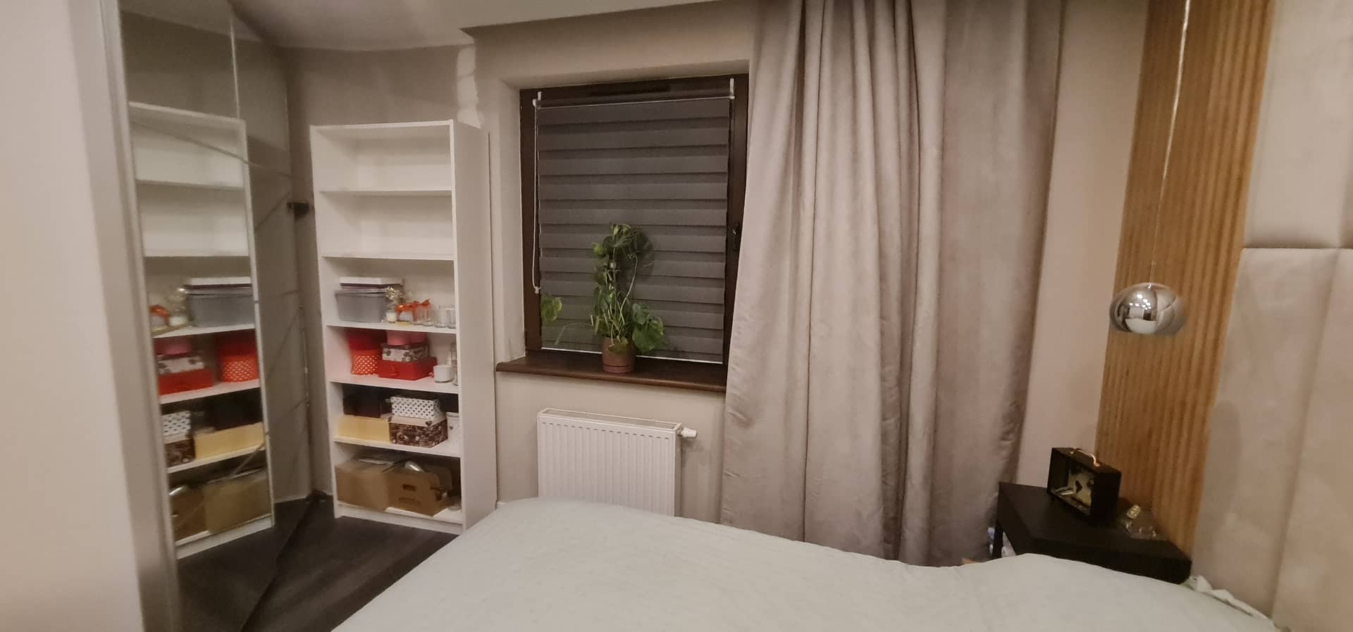 Przemyślany układ zapewnia komfort codziennego użytkowania. Na podłogach znajdują się panele oraz płytki, które nadają wnętrzu nowoczesny i estetyczny charakter. Dużym atutem jest nowa klimatyzacja z funkcją grzania, która zapewnia komfort zarówno latem, jak i w okresach przejściowych. Na oknach stylowe rolety "dzień i noc" oraz drewniane żaluzje. Na przedpokoju oraz w sypialni bardzo pojemne i funkcjonalne szafy. Na wyposażeniu wysokiej klasy sprzęt AGD w tym pralkosuszarka.