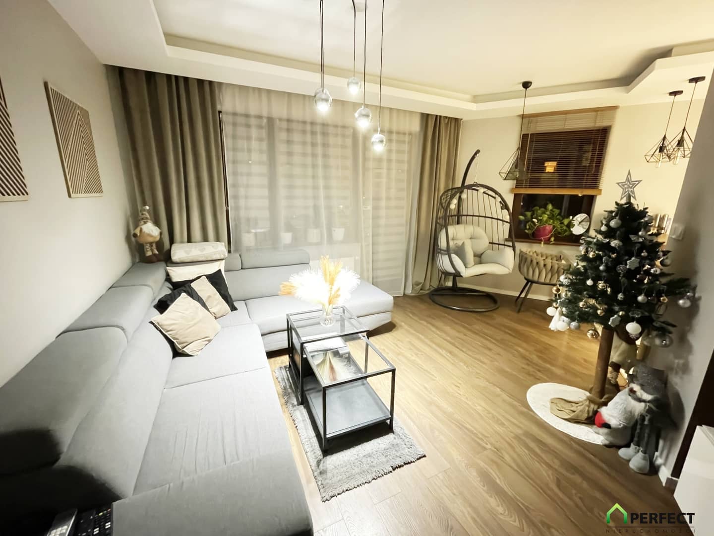 Mieszkanie urządzone zostało w sposób nowoczesny i bardzo funkcjonalny. W salonie, sypialni i kuchni podwieszono sufity oraz założono dodatkowe, klimatyczne oświetlenie ledowe. Na ścianach przyklejono ozdobne lamele oraz panele tapicerowane (w sypialni), co nadało wnętrzu dodatkowej przytulności.