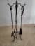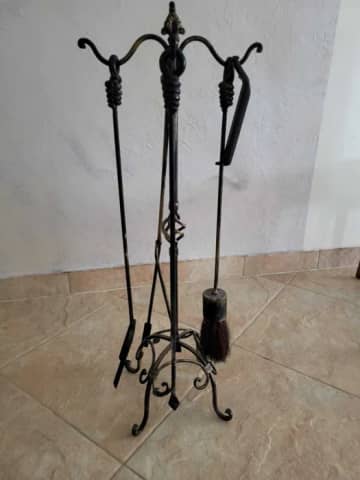 elegancki zestaw kominkowy w stylu rustykalnym wykonany z metalu w kolorze ( 4 elementy ) o wymiarach - wys. 83 cm, szer.31 cm i koszyk na drewno w kolorze czarnym z refleksami w kolorze złotej patyny ozdobiony dekoracyjnymi liśćmi i ptakiem ( wys. 44 cm, gł. 22 cm, szer. 42 cm). Idealny do przechowywania drewna. Solidna konstrukcja zapewnia długotrwałe użytkowanie. Stan bardzo dobry.