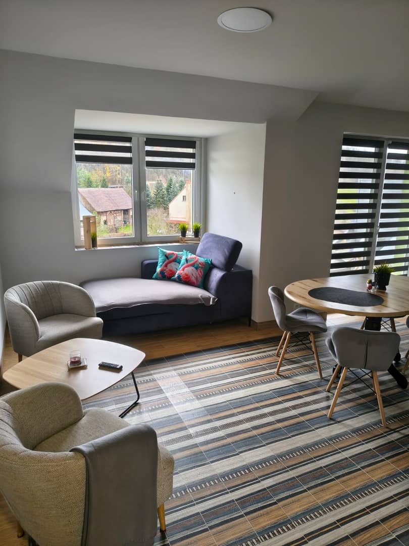 Przytulny apartament do wynajęcia, w gminie Jeżów Sudecki, w malowniczej miejscowości Wrzeszczyn, 7 km od Jeleniej Góry. Na powierzchnię mieszkalną 74 m2 składają się :