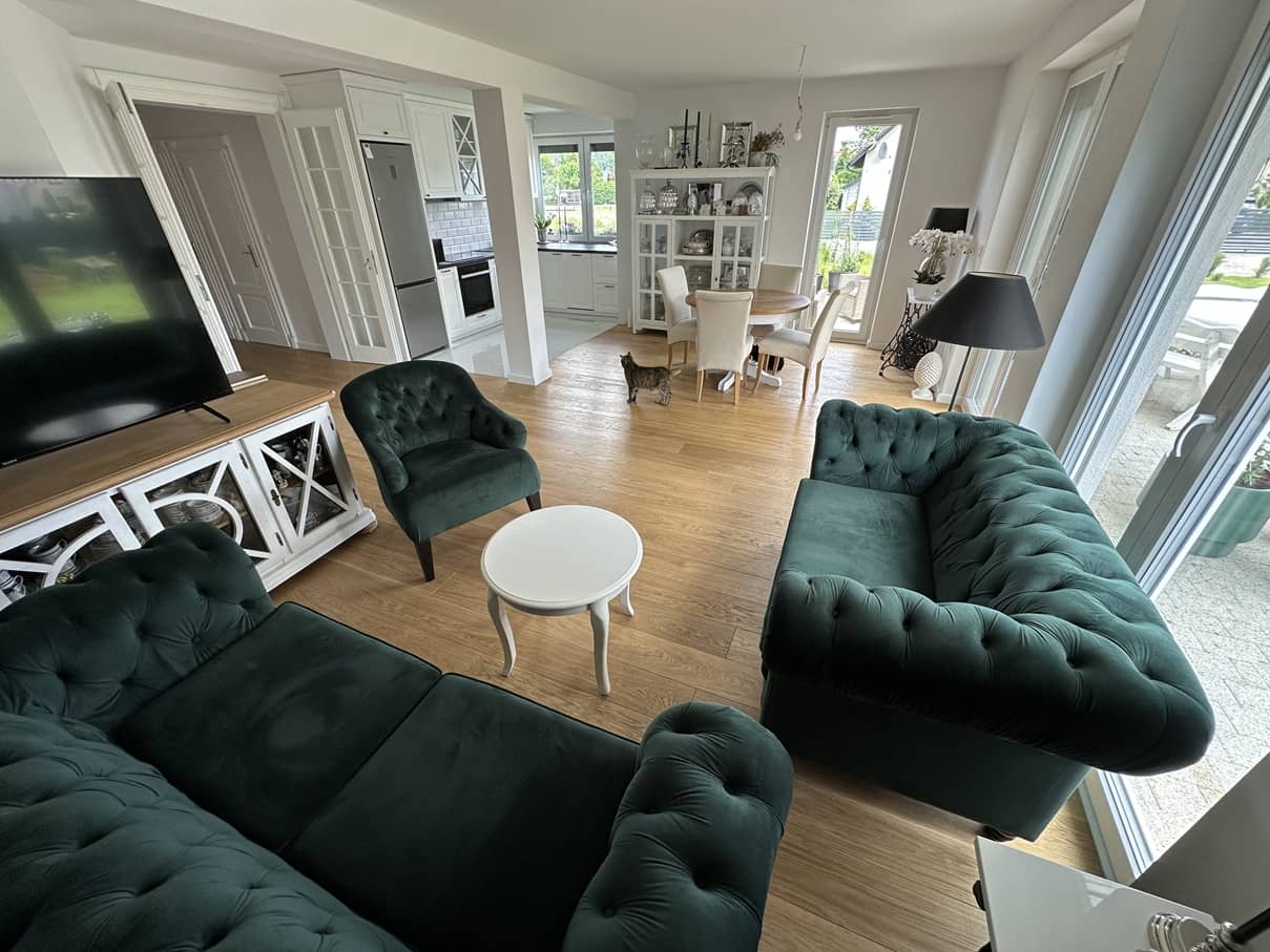 - przestronny, słoneczny i ustawny salon połączony z aneksem kuchennym o powierzchni 36m2 z dwoma wyjściami na dwa tarasy (25m2 i 12m) oraz wyjściem na ogród.
