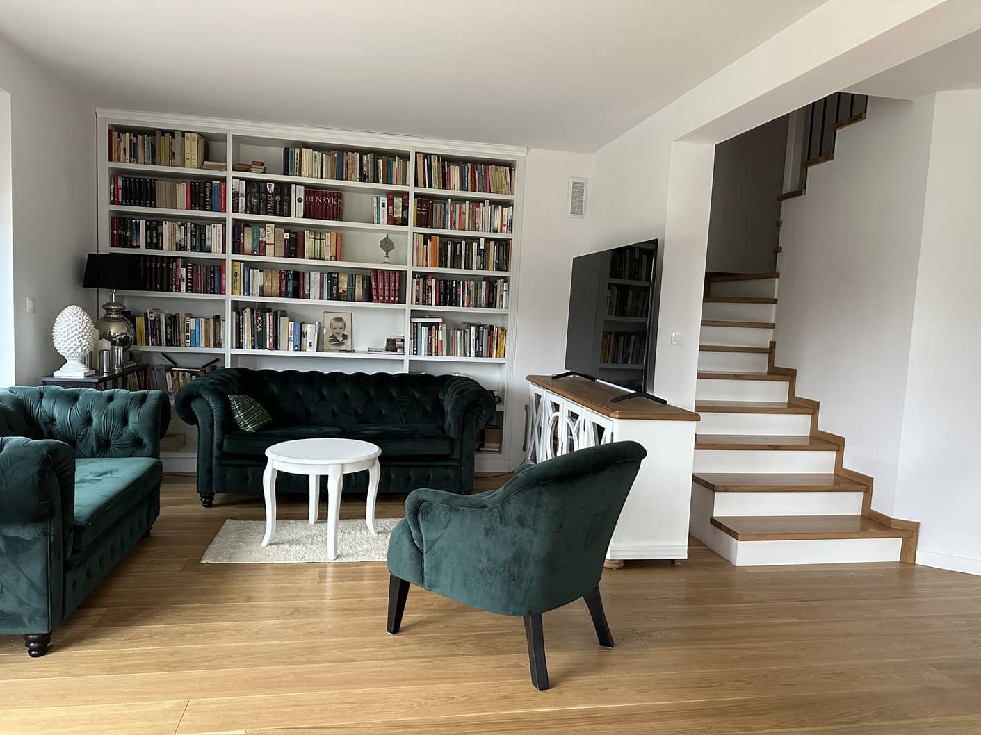 - dębowa okładzina schodów prowadzących na piętro