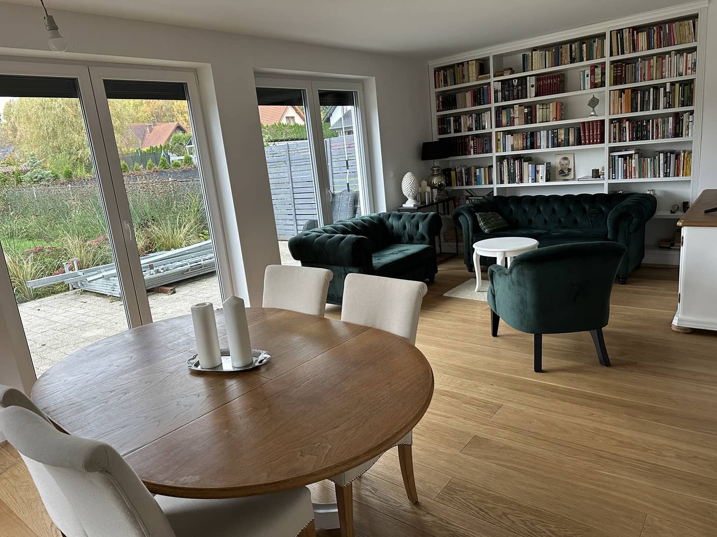 W cenie pozostaje zabudowa kuchenna ze sprzętem AGD, szafy w zabudowie oraz regał biblioteczny w salonie.