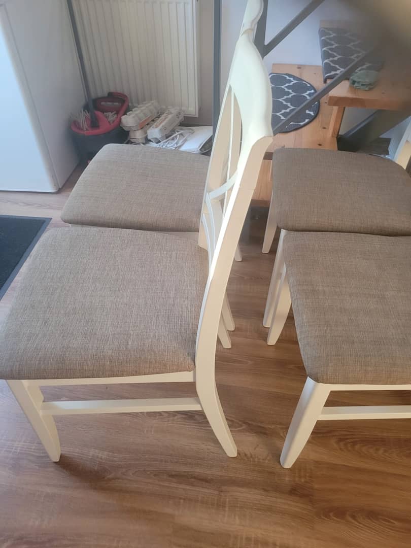 Cztery białe drewniane krzesła krzyżykowe w bardzo dobrym stanie. Wygodne i nie rozchwiane, możliwy transport. Cena 460 zł.