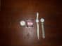 Sprzedam zestaw który składa się z czterech damskich zegarków. Rodzinne pozostałości. Zegarki te sprzedaje jako uszkodzone. W zegarkach brak baterii i noszą ślady użytkowania. W zestawie zegarek Chaika - ma podniszczony pasek/zegarek Genava - brakuje jednej części bransolety/zegarek Bijoux Terner - brak paska/zegarek Mz Rina -brak paska i jednego pręcika do zamocowania paska. 20 zł.