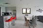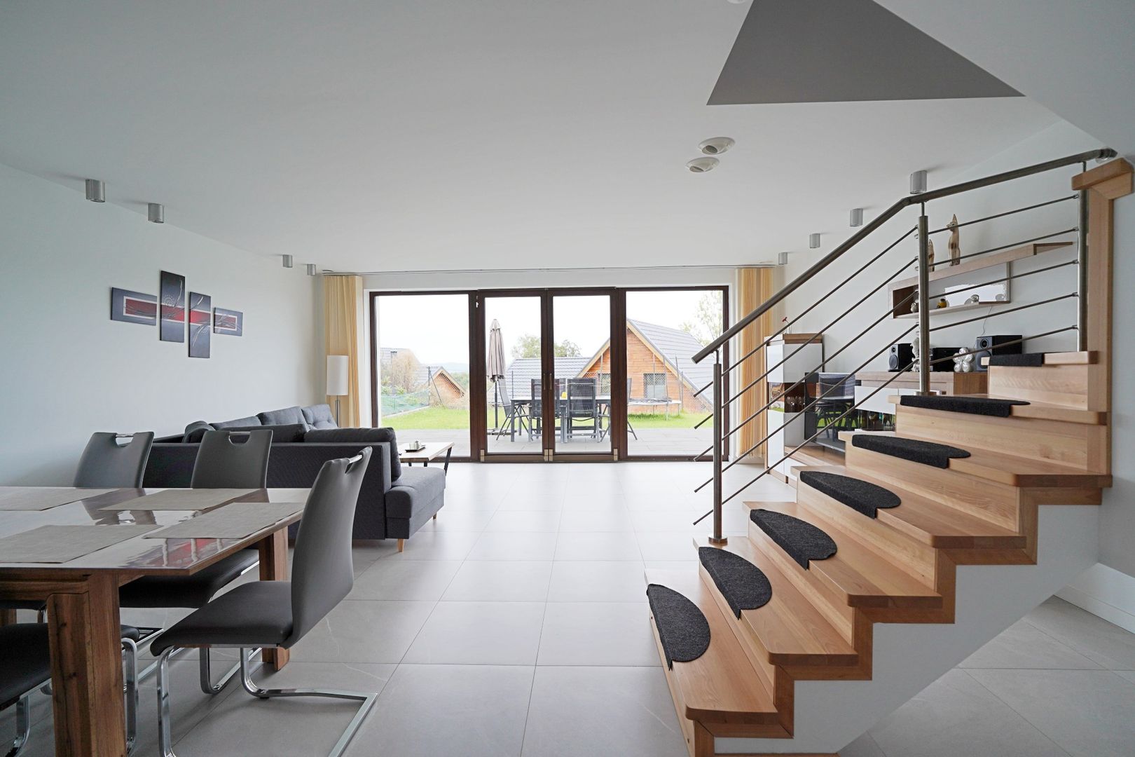parter - duży, przestronny salon z jadalnią i aneksem kuchennym oraz wyjściem na taras i ogród, przedpokój, łazienka z prysznicem