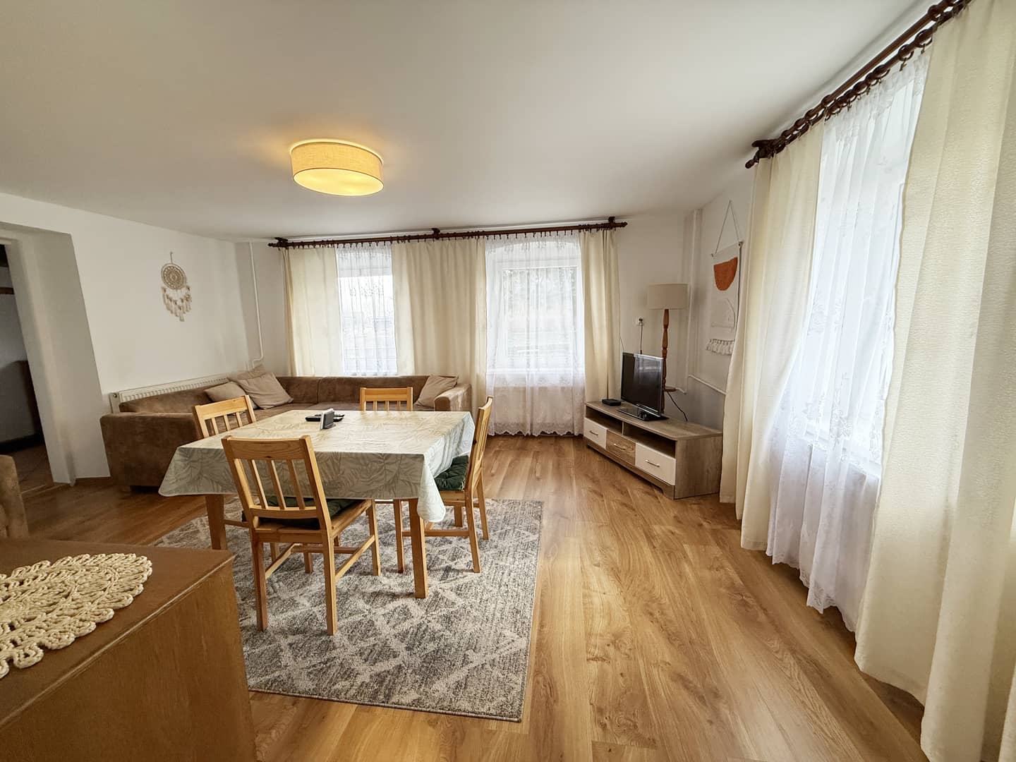 Okna PCV, na podłogach kafle, panele i deski.