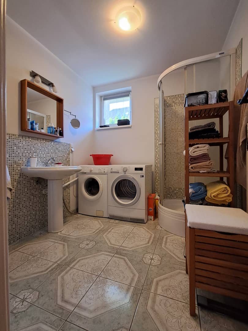 Na pierwszym piętrze znajdują się dwa pokoje, w tym jeden przestronny połączony z mansardą oraz nieduże pomieszczenie typu gabinet, łazienka z wanną, małe pomieszczenie gospodarcze, hol z którego jest wyjście na strych nieużytkowy.