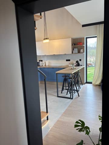 • Parter: przestronny salon z aneksem kuchennym i wyjściem na taras oraz ogród, sypialnia, łazienka