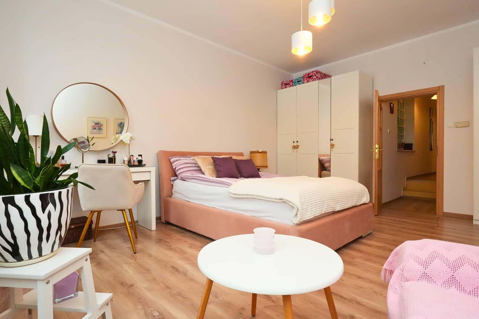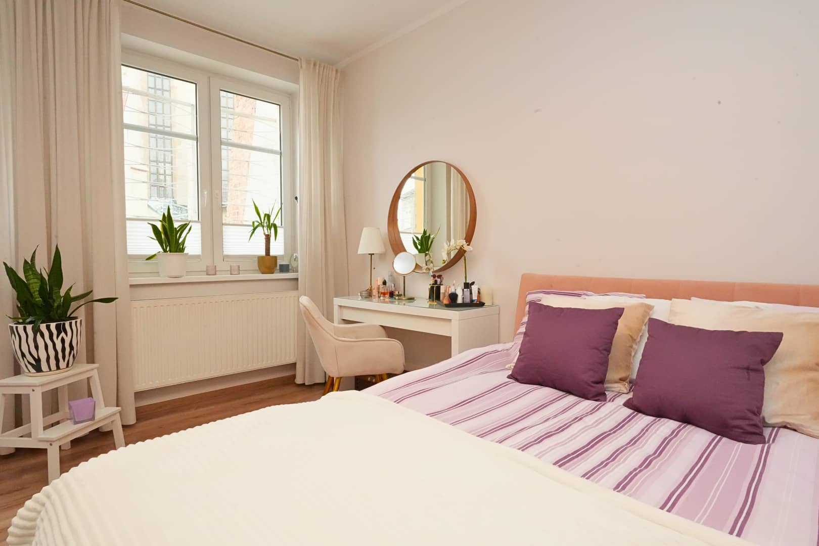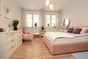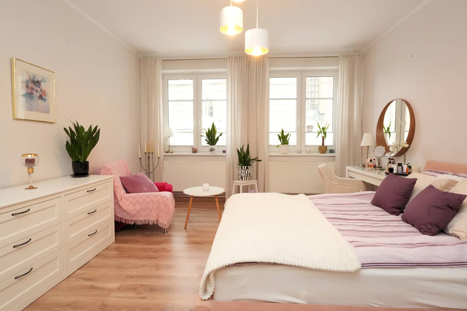 duża sypialnia z oknami wychodzącymi na spokojną część podwórza