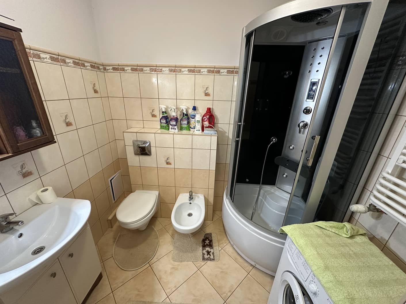- łazienka z WC, bidetem i kabiną prysznicową