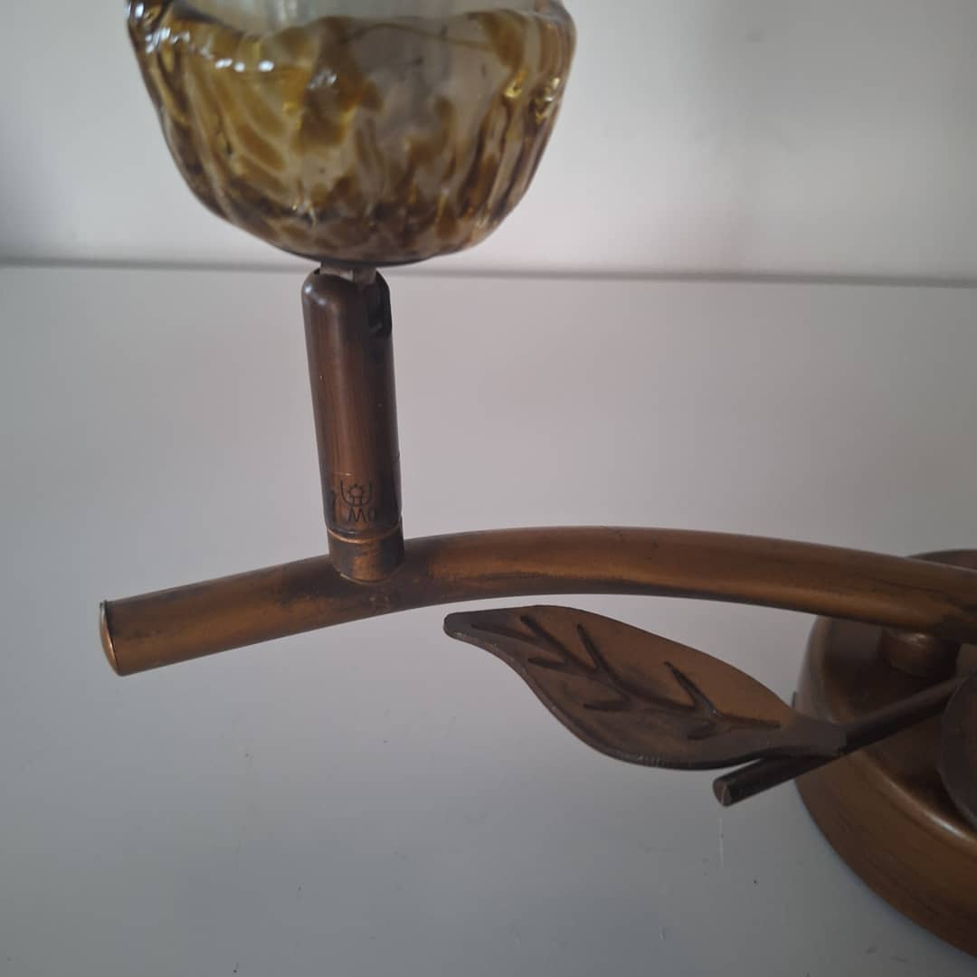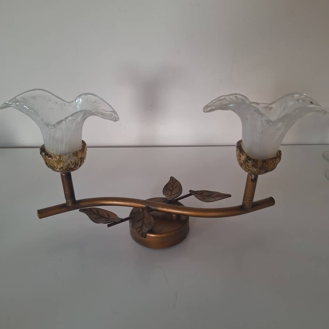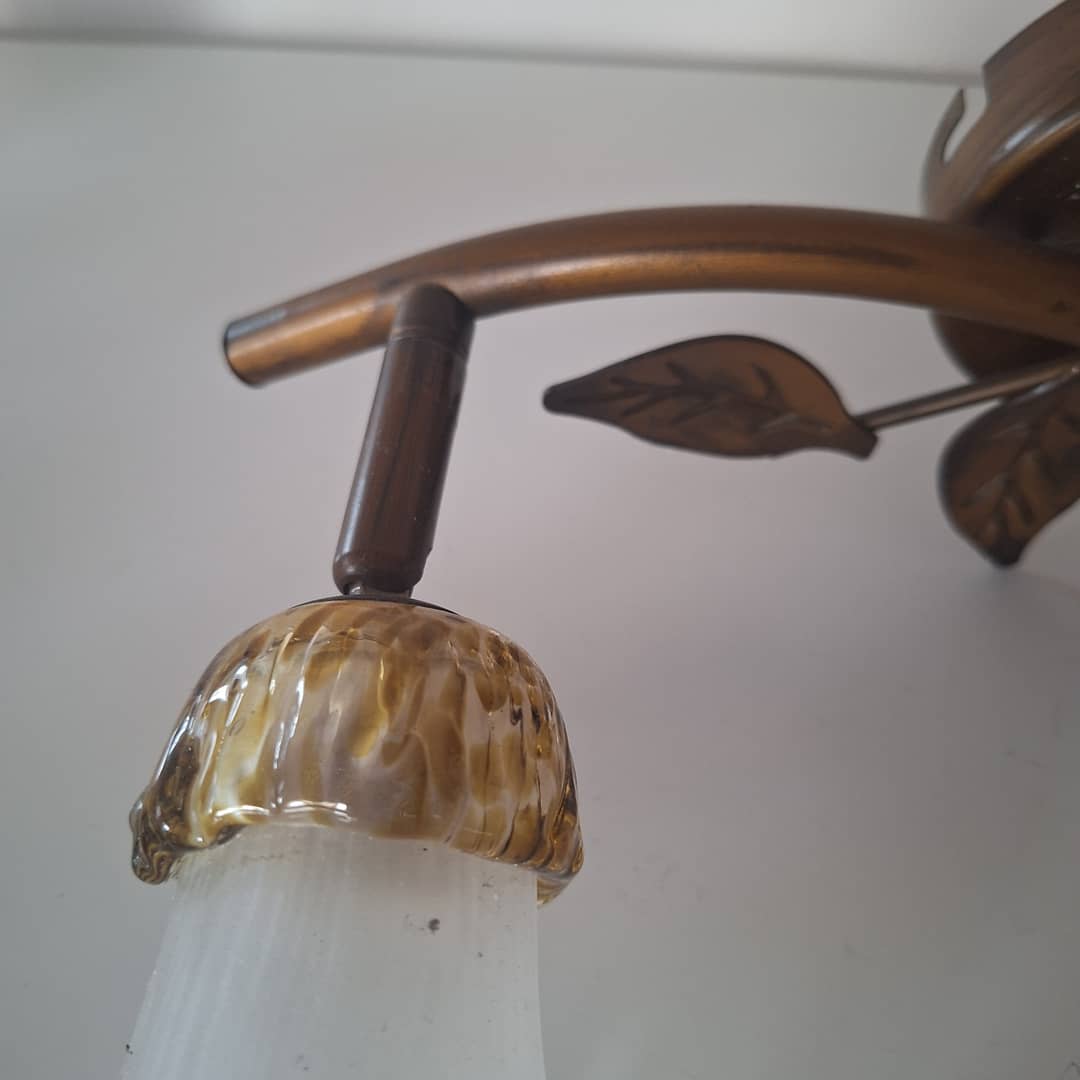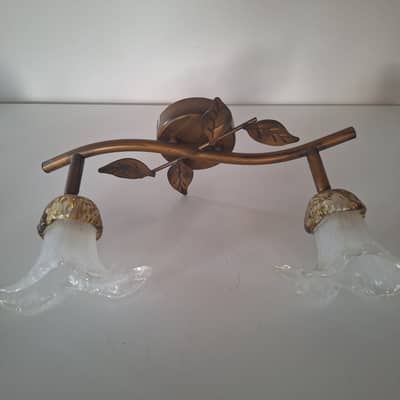 Kinkiet ścienny lub sufitowy, metal i szkło, bardzo ładny. Długość 33 cm, klosze są ruchome, regulowane .Możliwy dowóz lub wysyłka. Cena 50 zł.