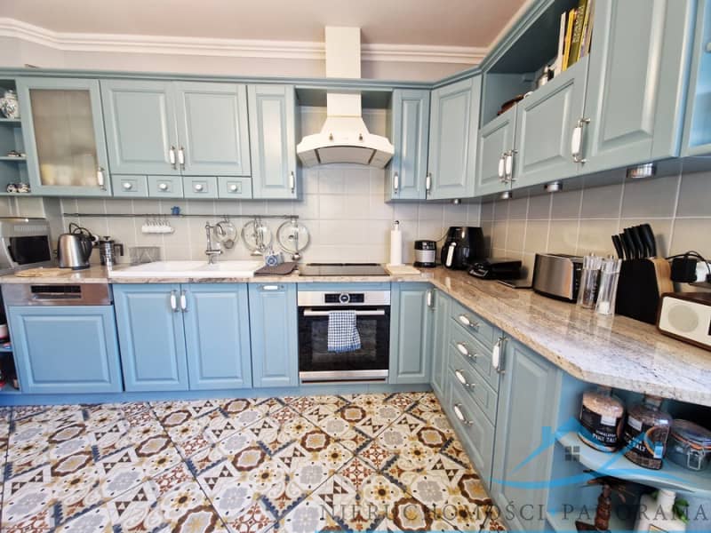 Piękna kuchnia w stylu angielskim z granitowym blatem została zaprojektowana z precyzją i dbałością o każdy szczegół. Połączona została z widną jadalnią, która kiedyś pełniła funkcję werandy.