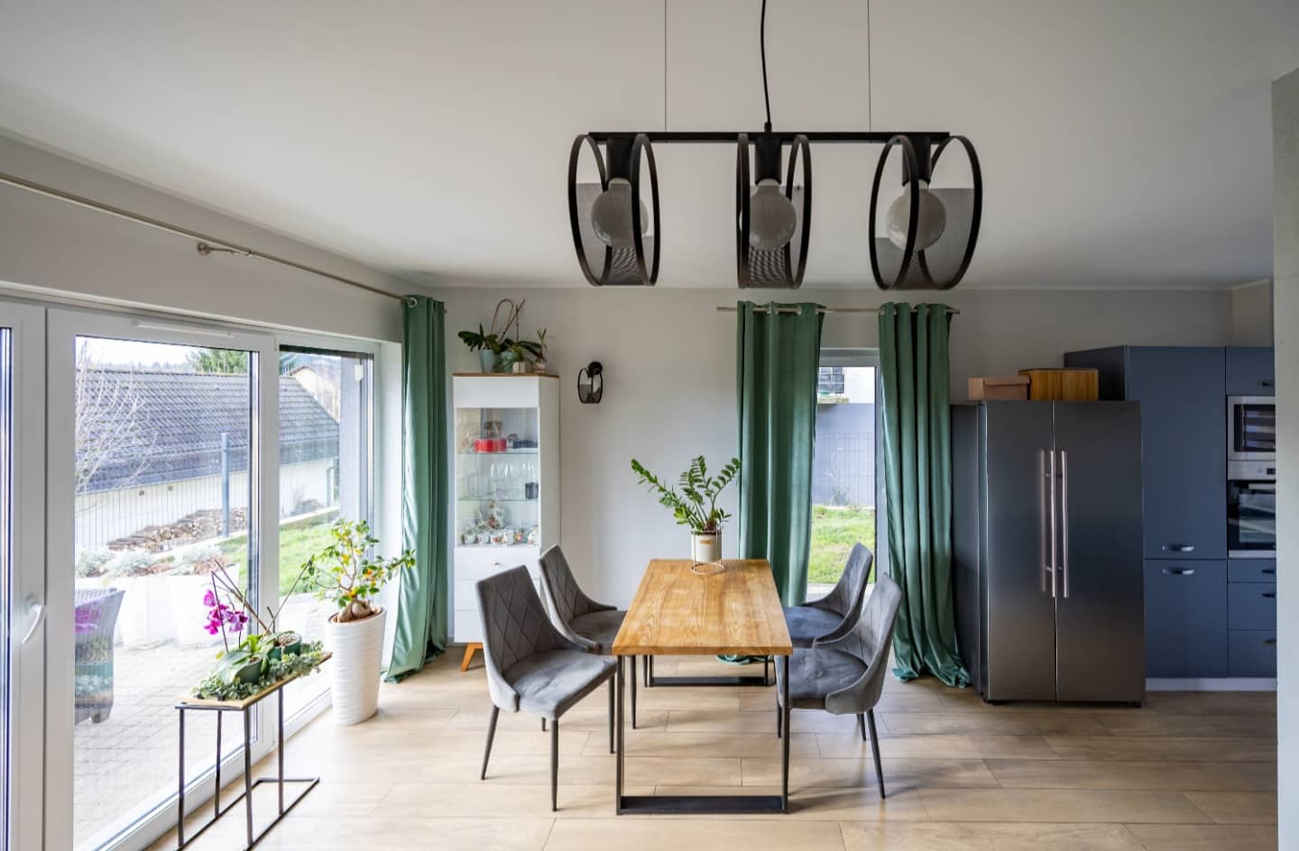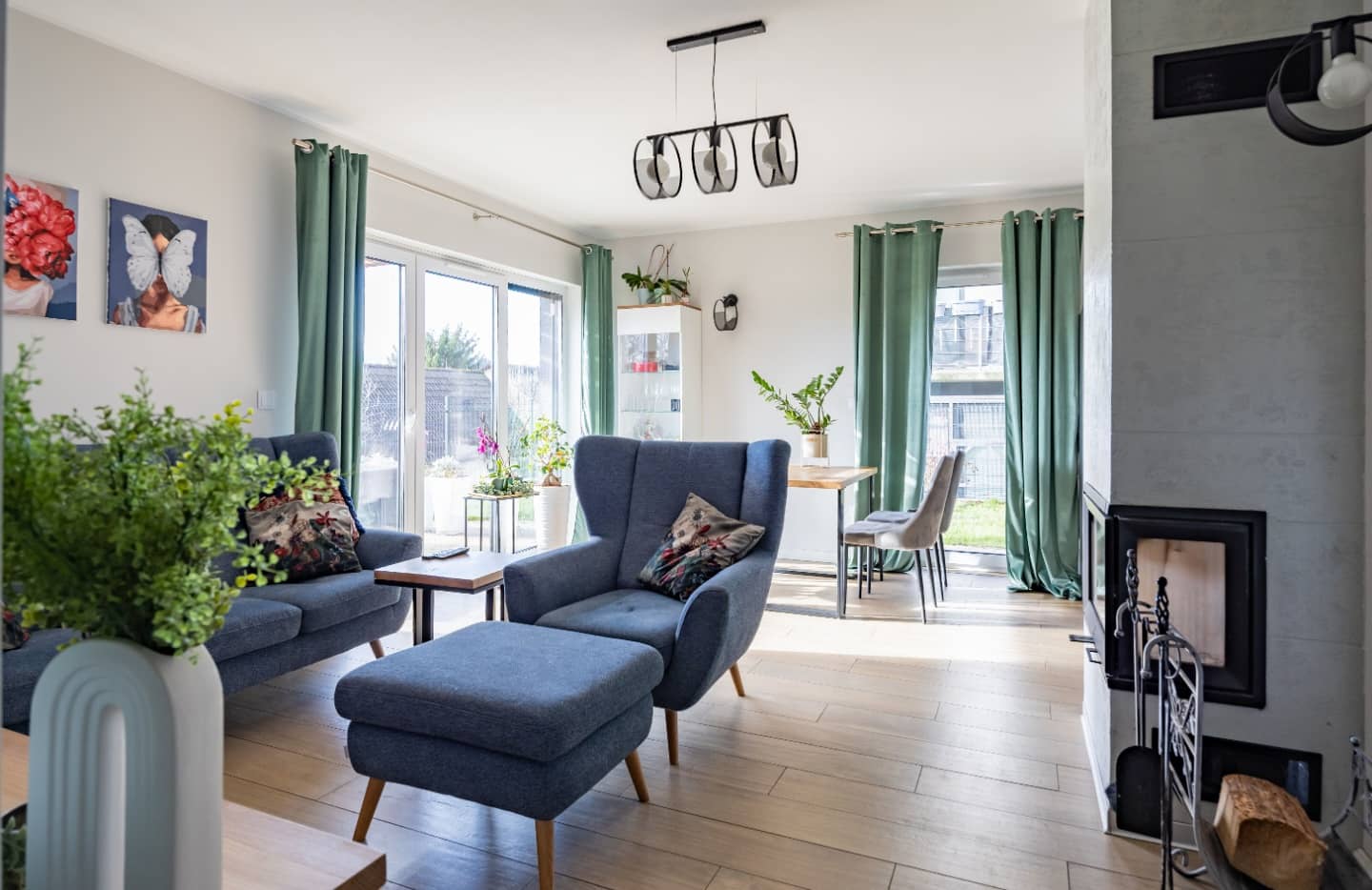 przestronny, jasny salon z aneksem kuchennym i jadalnią,