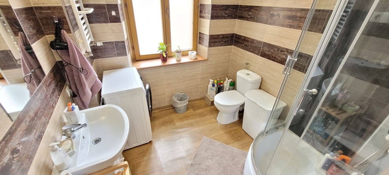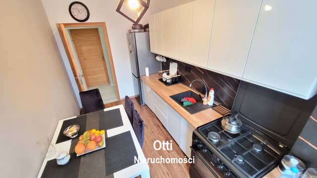 na ścianach kafle, po podłogach panele lub kafle, łazienka wykafelkowana, nowiutka zabudowa kuchenna, drewniane drzwi wewnętrze, wymieniona instalacja elektryczna, nowe drzwi wejściowe, oddzielna dodatkowa toaleta.