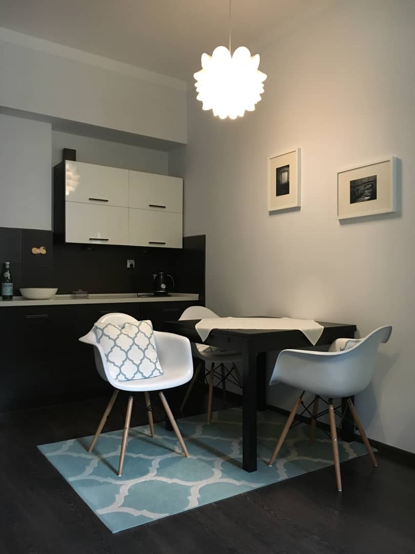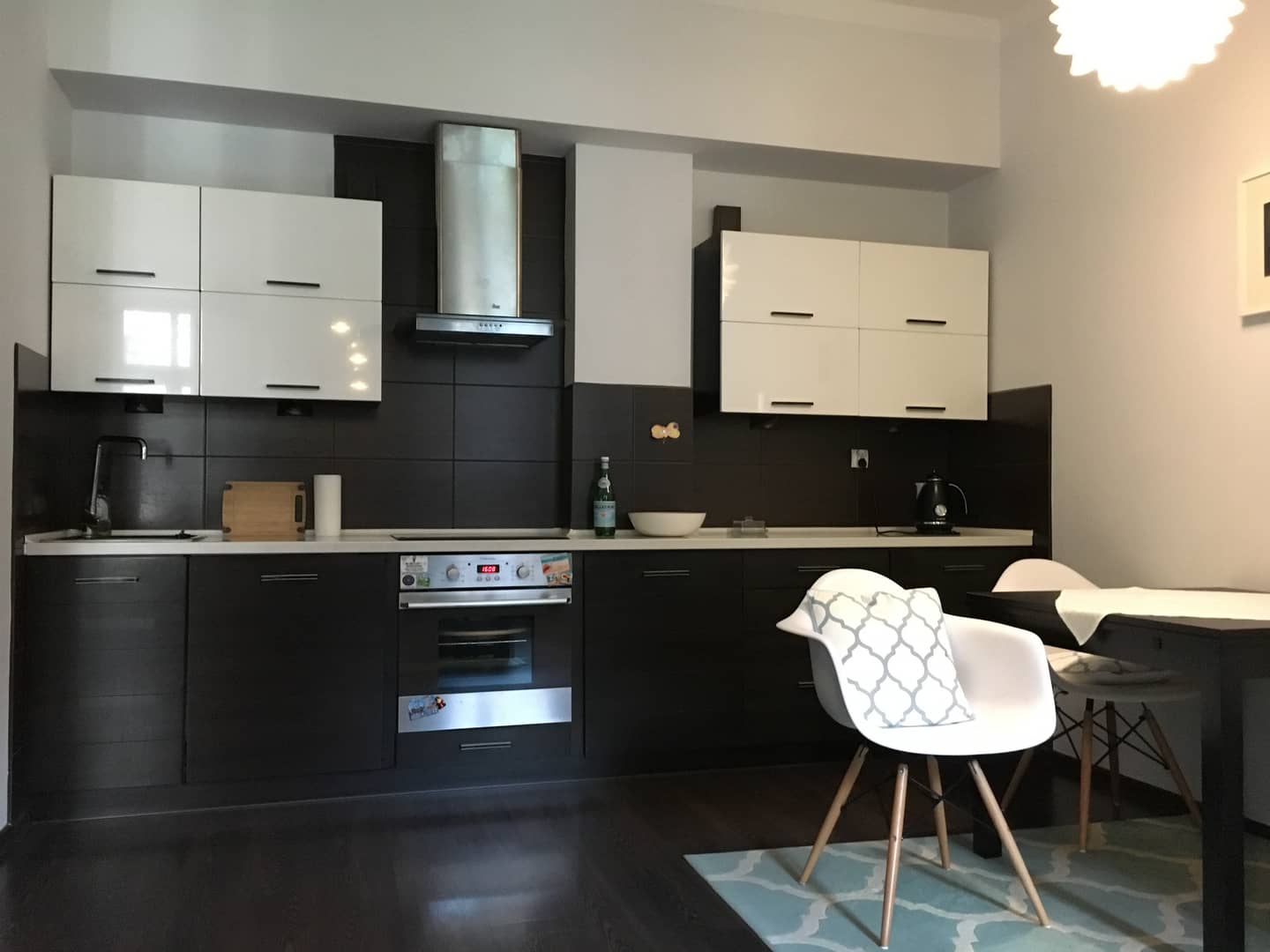 przestronny salon (stół z krzesłami, sofa, regał, komoda, ława) z aneksem kuchennym (lodówka, piekarnik, płyta, zmywarka)