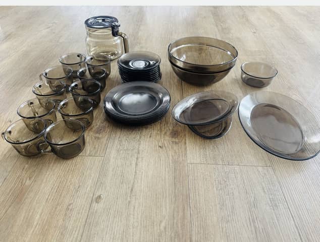 Zestaw zastawy stołowej ze szkła dymionego. Zawiera :