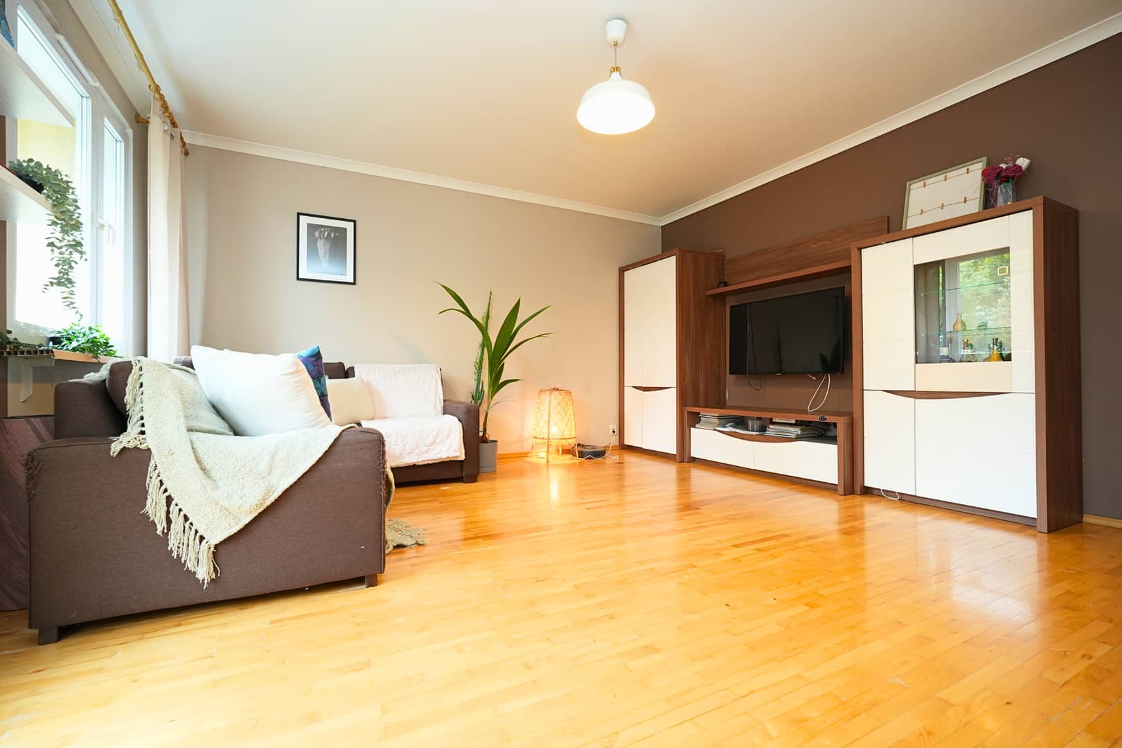 Na podłogach: drewniany parkiet w salonie, w pokojach panele, reszta pomieszczeń w kaflach. Okna PCV.