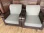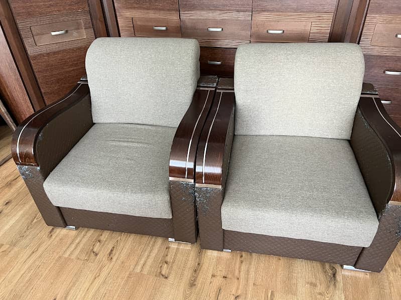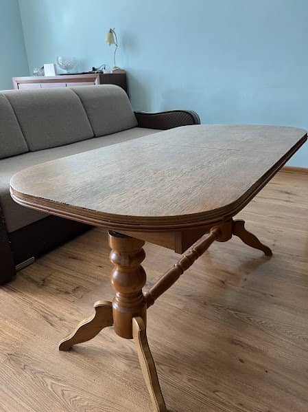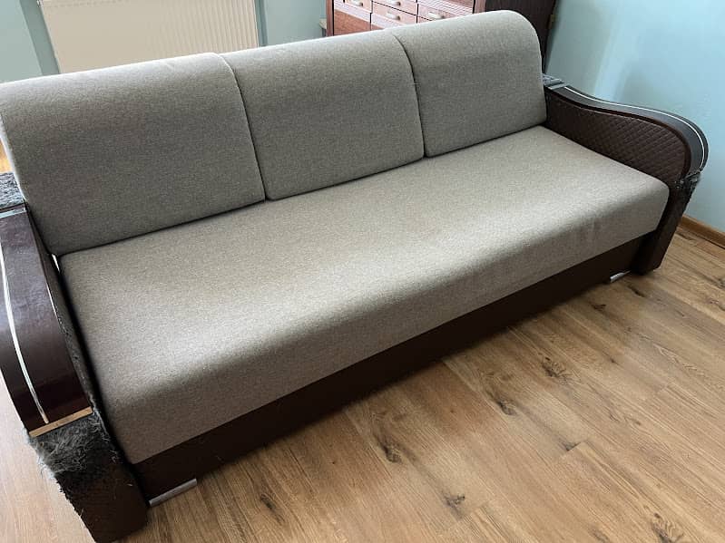 Oddam meble - sofa rozkładana z szufladą na pościel, dwa fotele oraz rozkładaną ławę. Tapicerka na sofie i fotelach lekko zniszczona tylko na bokach mebli, poza tym meble w dobrym stanie.
