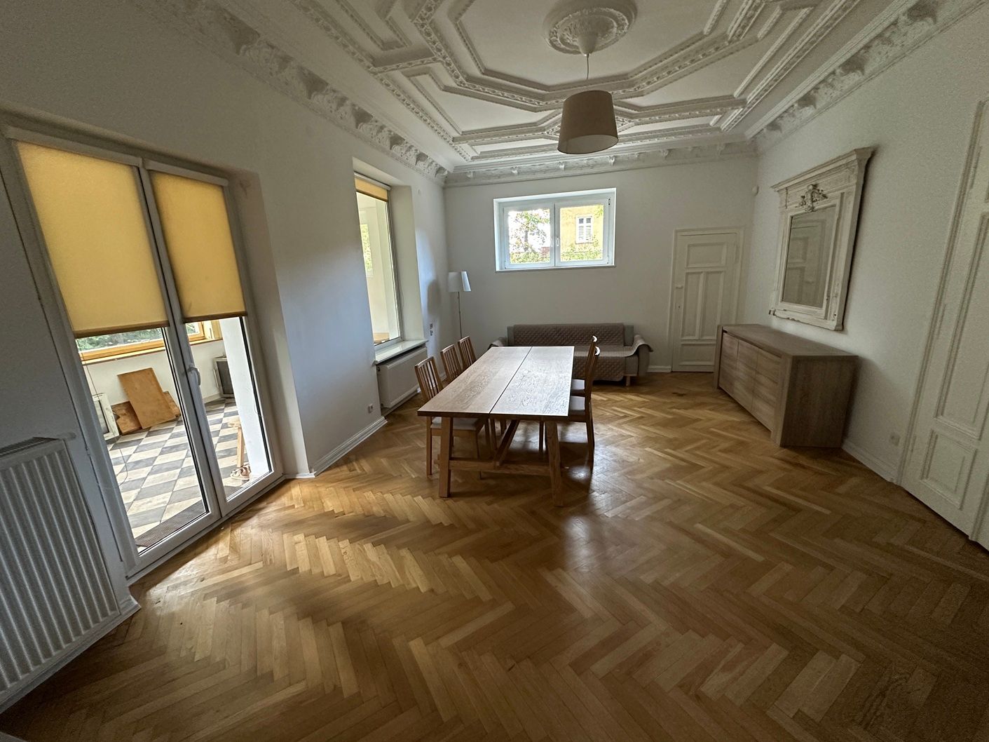 Jednym słowem oferujemy do wynajmu klimatyczny parter willi z pięknymi stiukami i zabytkowymi piecami składające się z czterech przestronnych pokoi, dużej werandy oraz wielkim ogrodem.