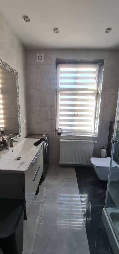 Lokal został wykończony z dbałością o detale przy użyciu materiałów wysokiej jakości, dzięki czemu wnętrze jest estetyczne, funkcjonalne i gotowe do zamieszkania. Na podłogach znajdują się płytki oraz panele, a okna PCV wyposażone są w eleganckie rolety dzień–noc, które zapewniają komfort oraz prywatność.