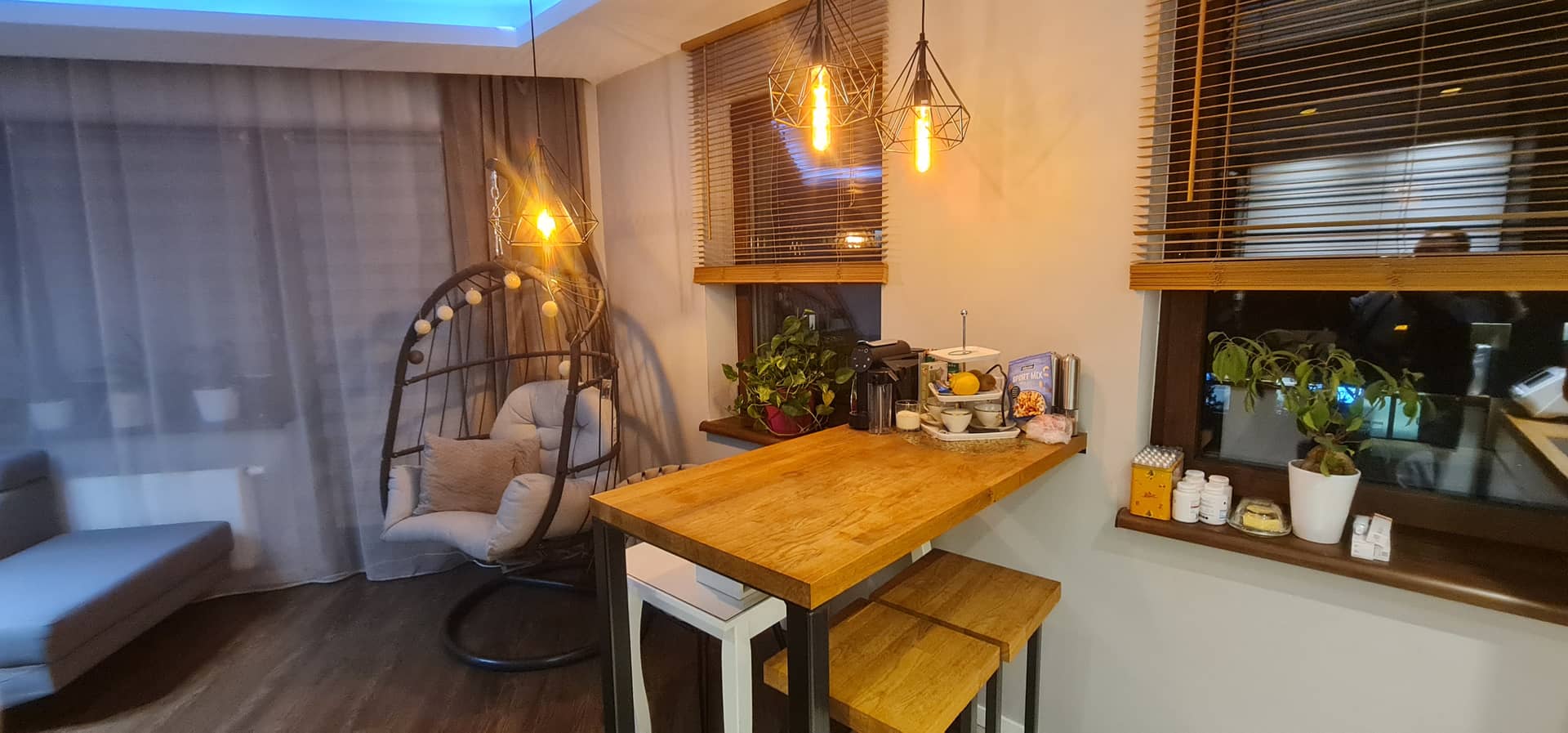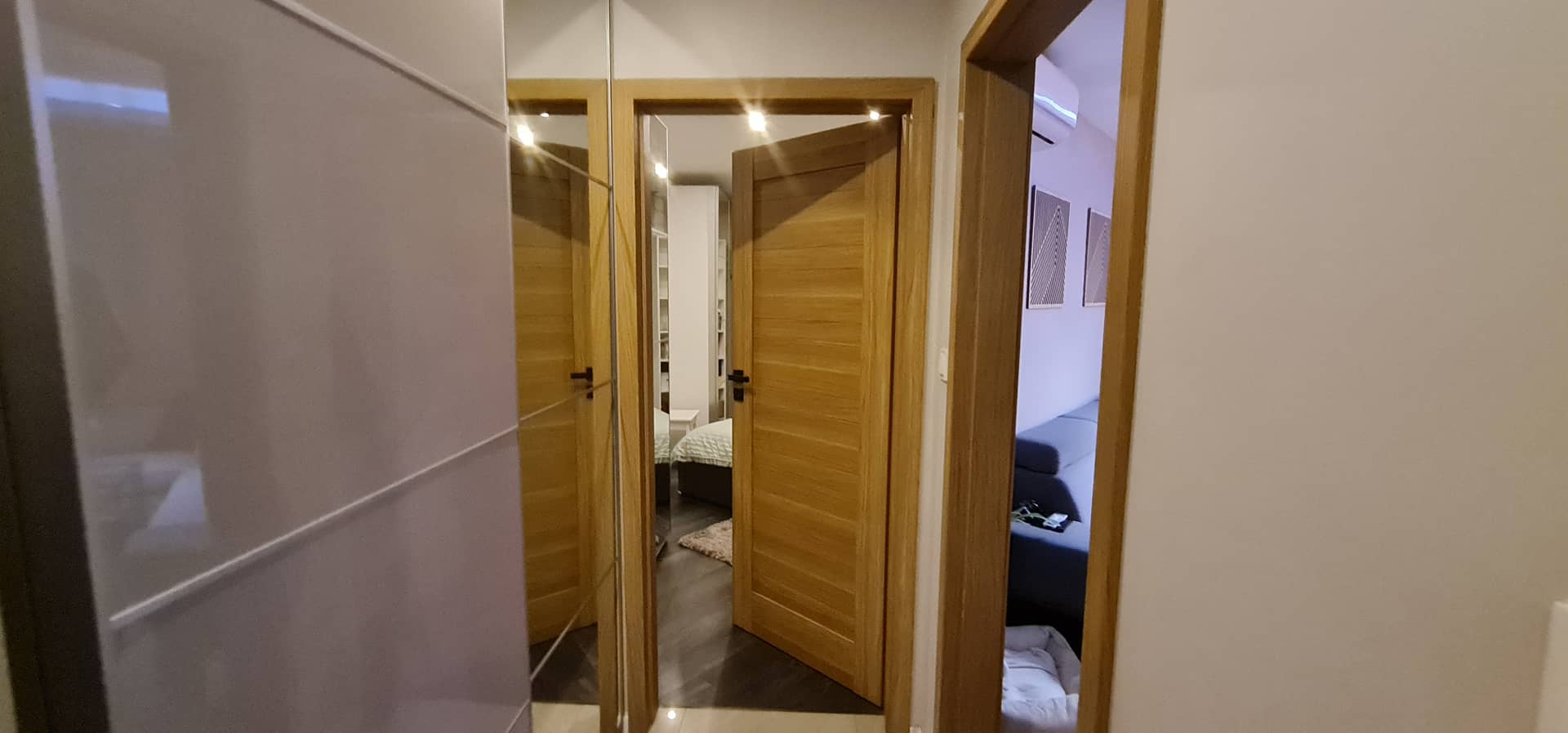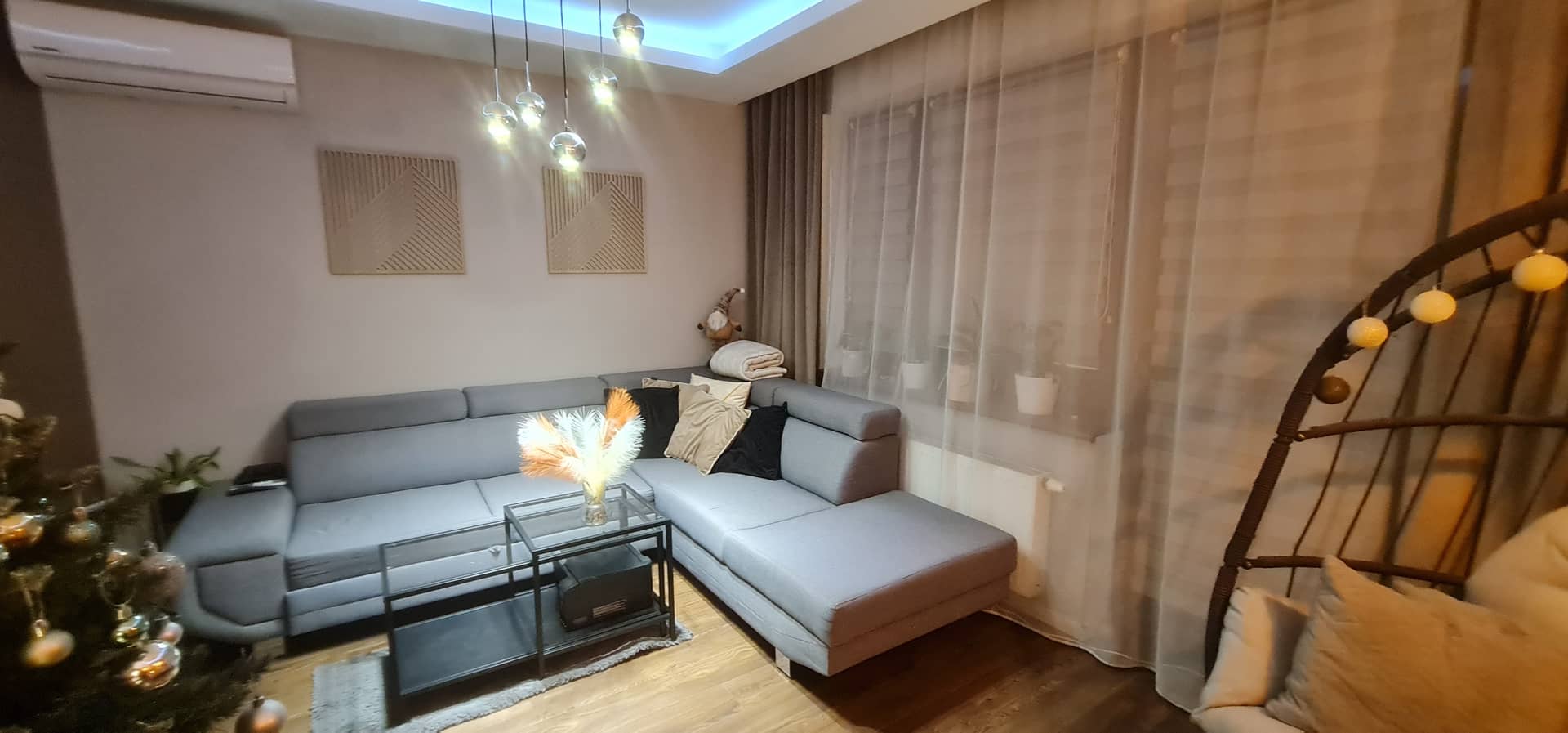 Przemyślany układ zapewnia komfort codziennego użytkowania. Na podłogach znajdują się panele oraz płytki, które nadają wnętrzu nowoczesny i estetyczny charakter. Dużym atutem jest nowa klimatyzacja z funkcją grzania, która zapewnia komfort zarówno latem, jak i w okresach przejściowych. Na oknach stylowe rolety "dzień i noc" oraz drewniane żaluzje. Na przedpokoju oraz w sypialni bardzo pojemne i funkcjonalne szafy. Na wyposażeniu wysokiej klasy sprzęt AGD w tym pralkosuszarka.