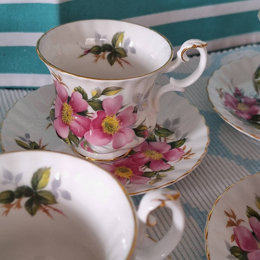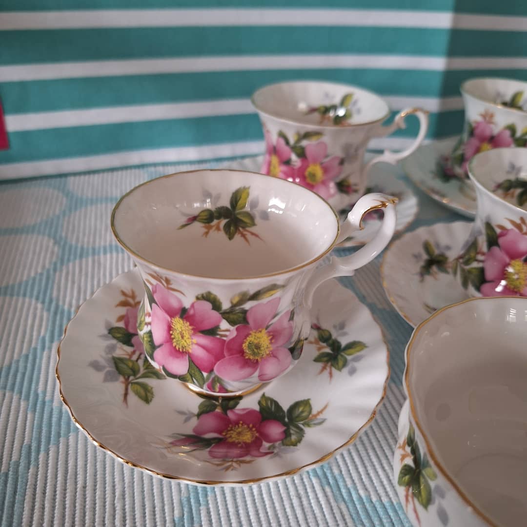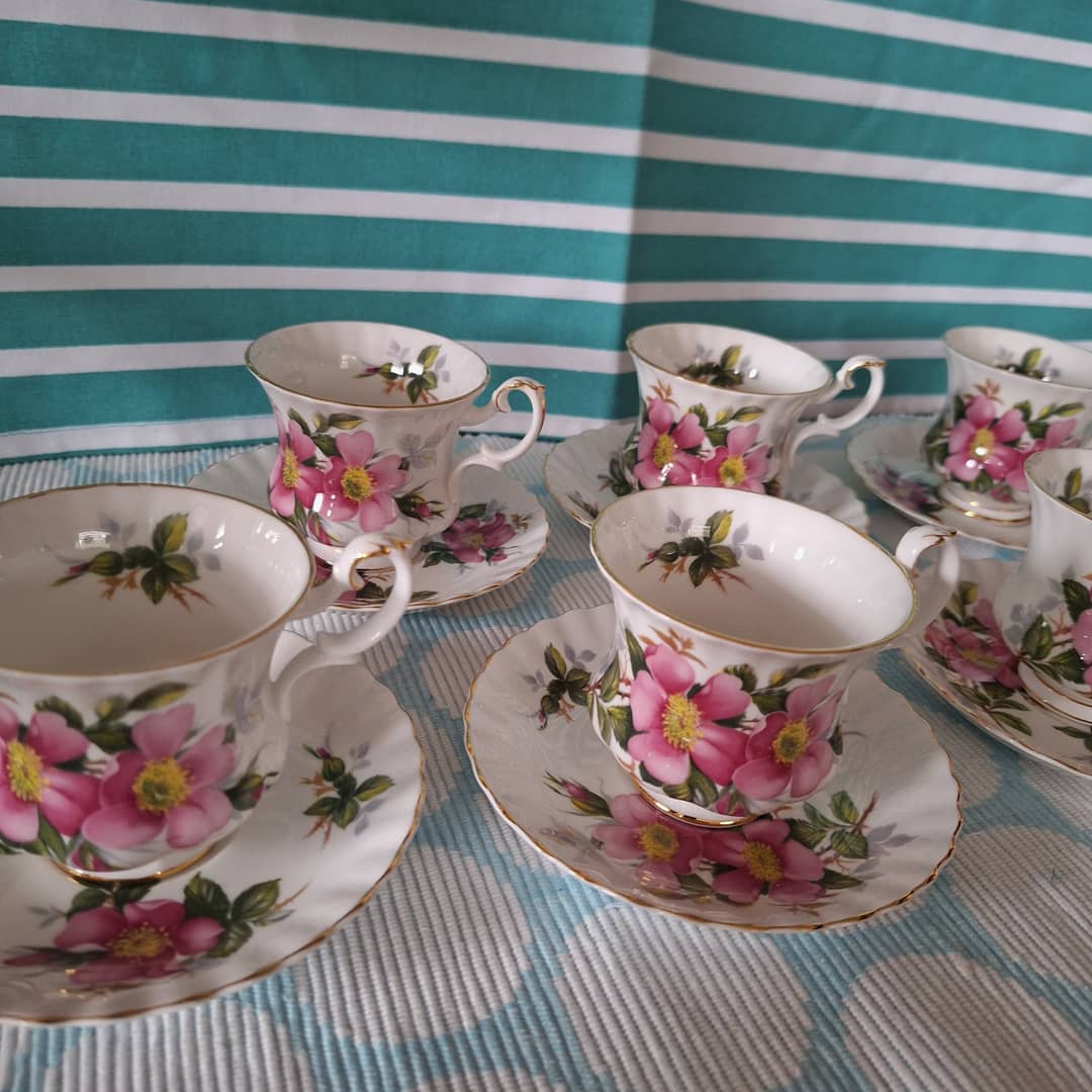 Serwis porcelanowy Royal Albert z serii Prairie Rose ,w skład wchodzi 6 filiżanek ze spodkami, talerzyki deserowe, cukierniczka I patera. Możliwy dowóz lub wysyłka. Cena za komplet 390 zł.