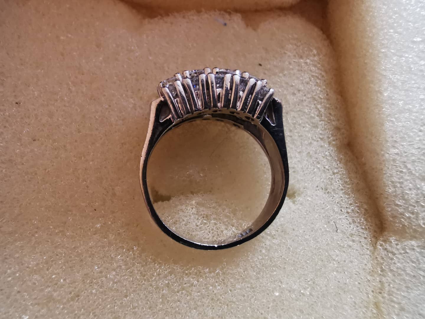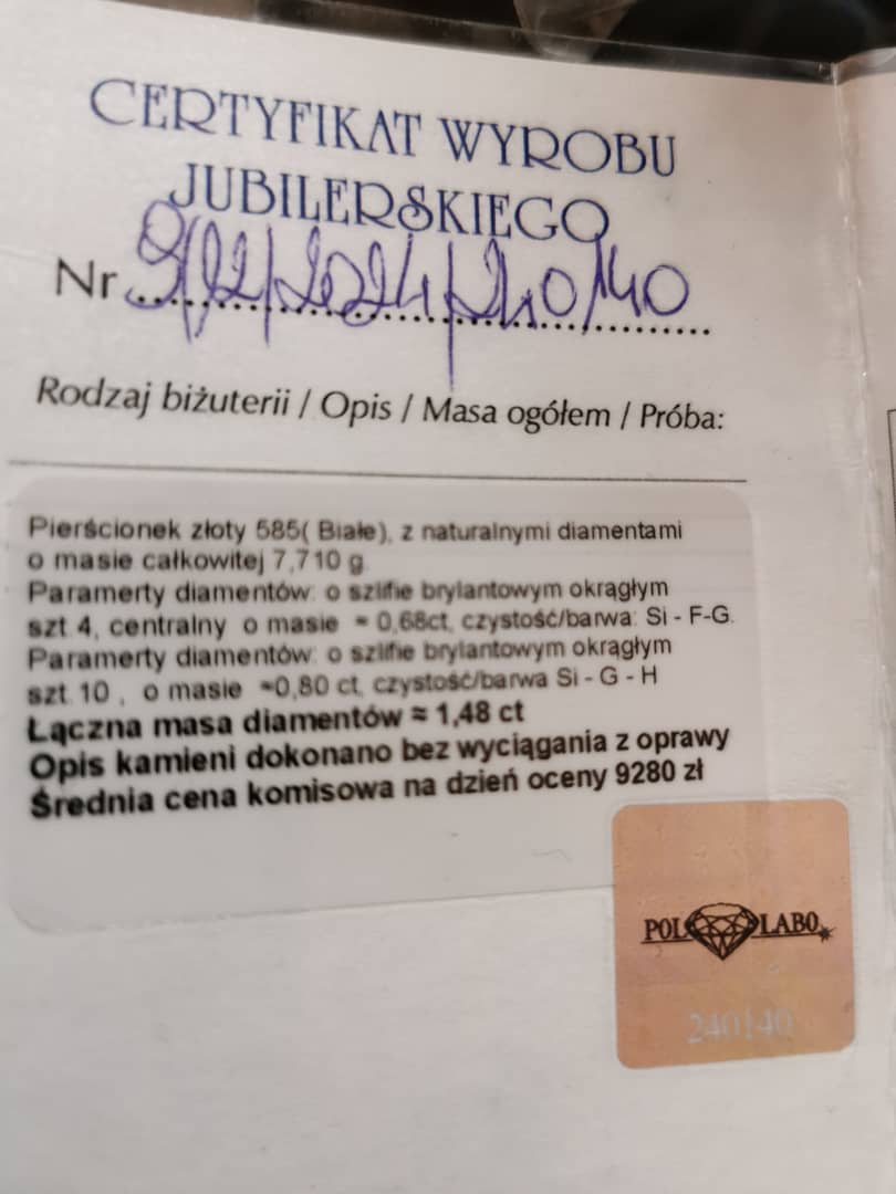 Sprzedam Pierścionek z białego złota próba 585 z diamentami diamenty naturalne wyrób przedwojenny rozmiar pierścionka 14 certyfikat i wycena sprzedam za połowę ceny z certyfikatu około 5 tys