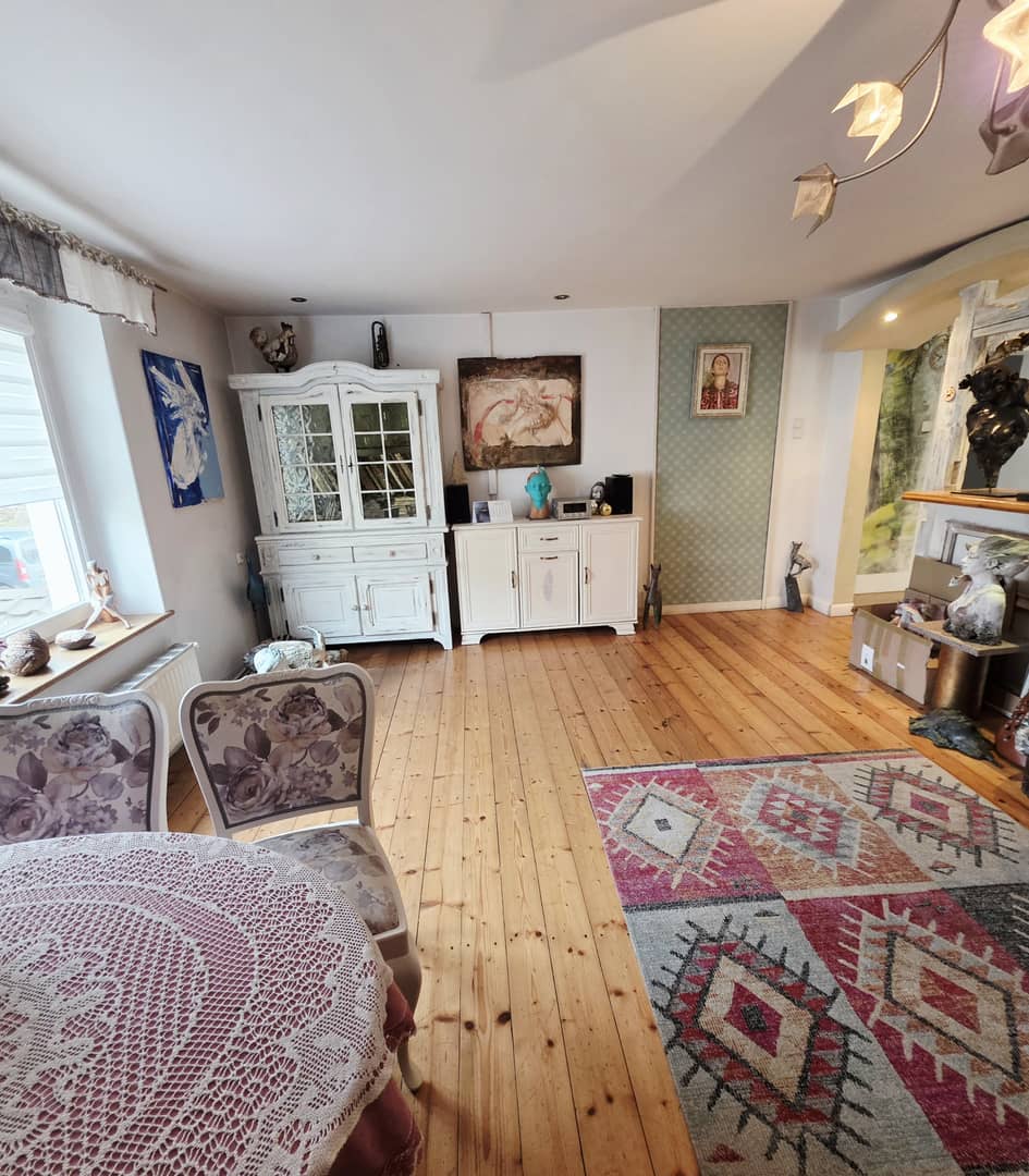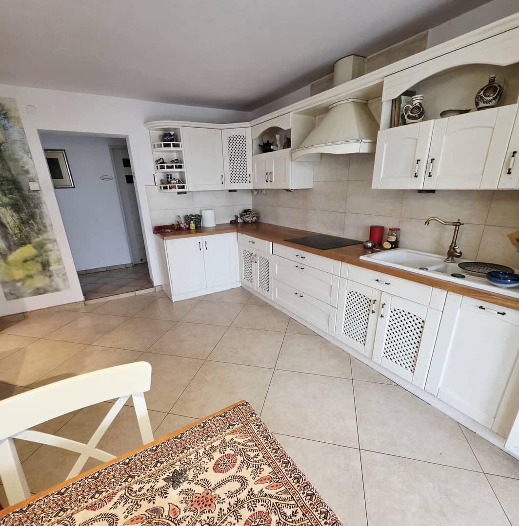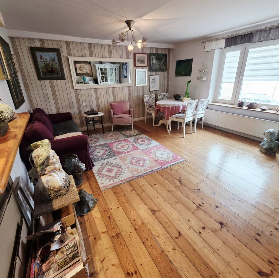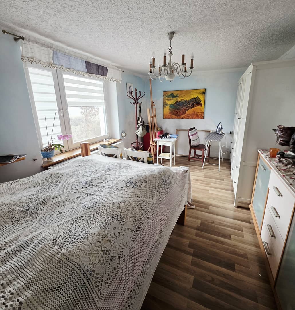 Połowa domu w podziale pionowym, położona na Pogórzu Kaczawskim w gminie Lwówek Sląski. Usytuowany na działce o powierzchni 2400 m2 do użytku z sąsiadem (każdy umownie korzysta z zagospodarowanej części) o powierzchni całkowitej 150 m2, na krórą składa się, w parterze garaż z kotłownią, spiżarnia, dwa pokoje, w tym jeden z wyjściem do prywatnego ogrodu z altanką, połączone schodami z pierwszym piętrem, jak również klatka schodowa od ganku budynku, jako wejscie główne. Na piętrze znajduje się korytarz, ładna widna kuchnia z balkonem, wyposażona i umeblowana, połączona z salonem, 2 sypialnie oraz łazienka. Mieszkanie po remoncie, wymienione wszystkie instalacje. Okna pcv, ściany gładzie, na podłogach panele, deski oraz płytki. Ogrzewanie piecem na paliwo stałe. Do zamieszkania bez dodatkowych nakładów finansowych. Teren w części zagospodarowany, własne miejsce parkingowe. Dodatkowo w cenie działka budowlana 900 m2, granicząca z terenem na którym stoi dom. Bardzo atrakcyjna i spokojna okolica, dużo terenów zielonych. Do Lwówka Śląskiego 7 km, do Płatnej Dolnej również 7 km. Atrakcyjna cena 429 000 zł do negocjacji, zapraszam na prezentację Nieruchomości dostępnej tylko w Naszym biurze Nieruchomości Rychlewski