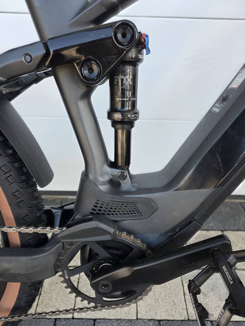 12-biegowa przekładnia Shimano DEORE XT z zawieszeniem Fox i napędem elektrycznym Bosch: komfort roweru hybrydowego z pełnym zawieszeniem.