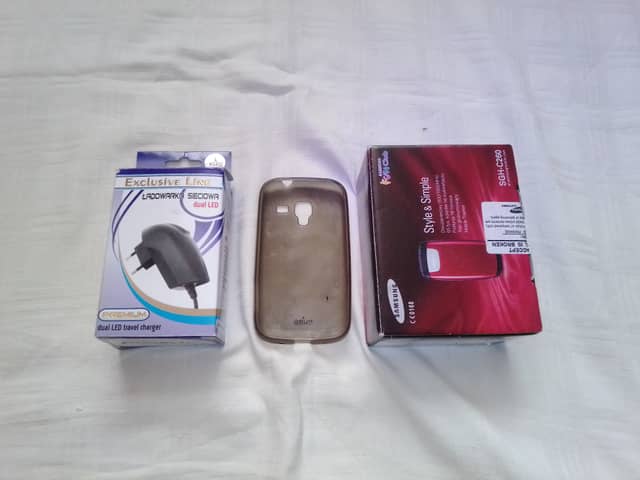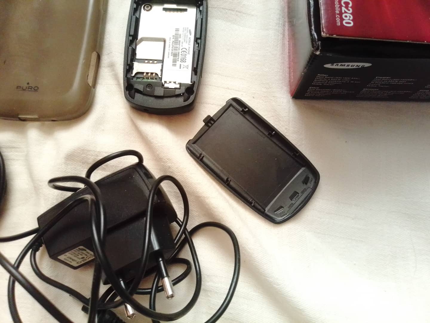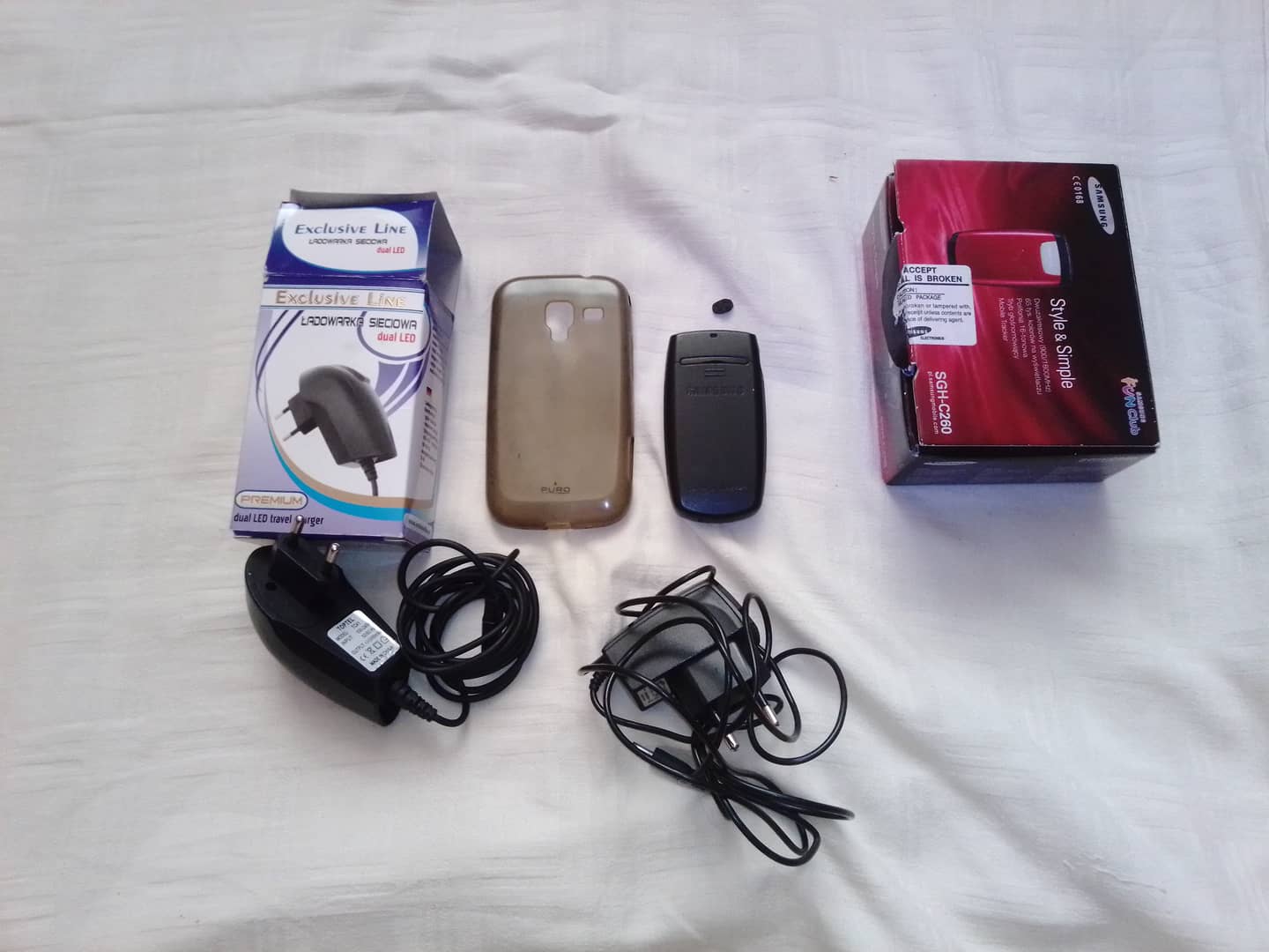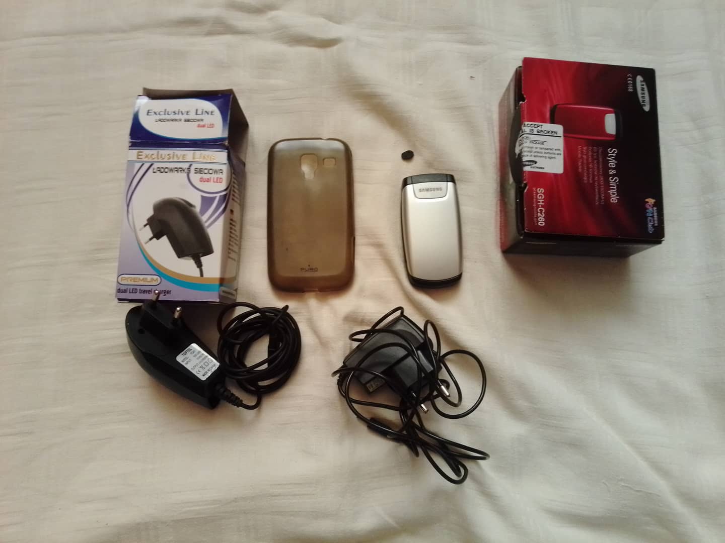 Sprzedam różności telefoniczne składające się z etui Puro do Samsung Galaxy Y duos GT-S6102 0 niewielkie ślady użytkowania, nowej ładowarki Toptel TC41 do Lg KG800 (pudełko jest lekko podniszczone) oraz telefonu Samsung SGH-C260 wraz z oryginalnym pudełkiem i ładowarką (brak baterii, osłona gniazda słuchawkowego i tylna klapka ma ułamany zaczep i odpadają) z przeznaczeniem na części - niewielkie ślady użytkowania. 25 zł.