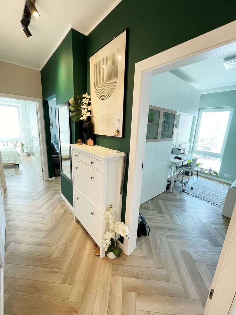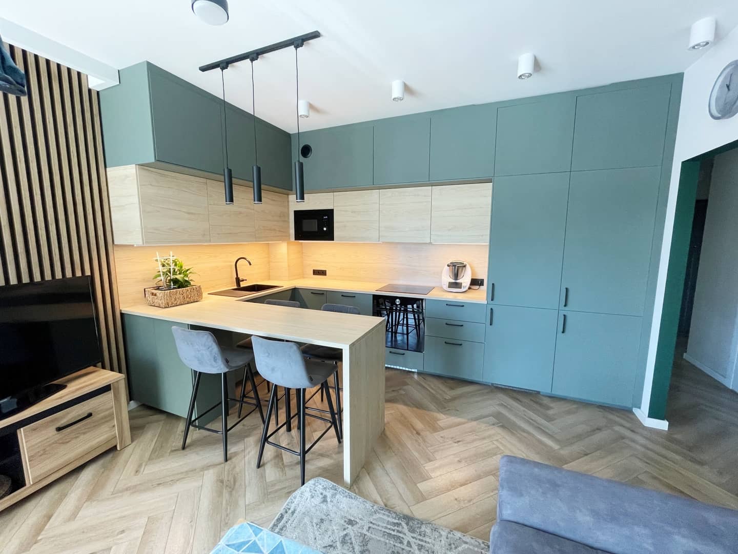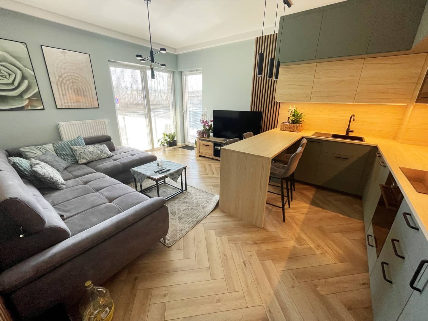 Na podłogach panele winylowe (imitujące deskę), na ścianach gładzie, tapety i dekoracyjne lamele. Większość umeblowania - w zabudowie (łącznie ze spiżarnią w zabudowie), sprzęt AGD - wysokiej jakości (m.in. piekarnik z pyrolizą), oświetlenie z regulacją barwy, dodatkowe: ledy posufitowe i podszafkowe.