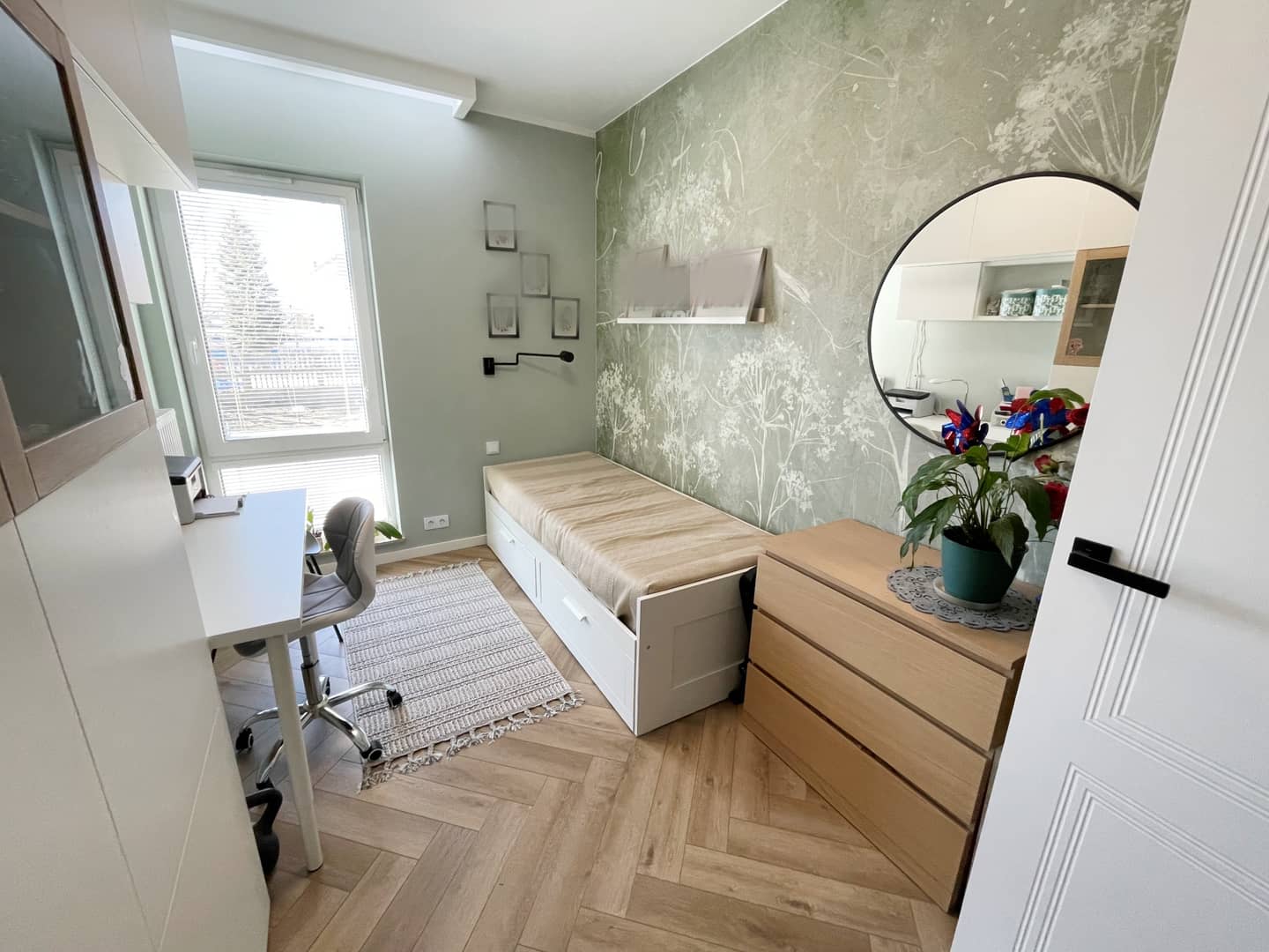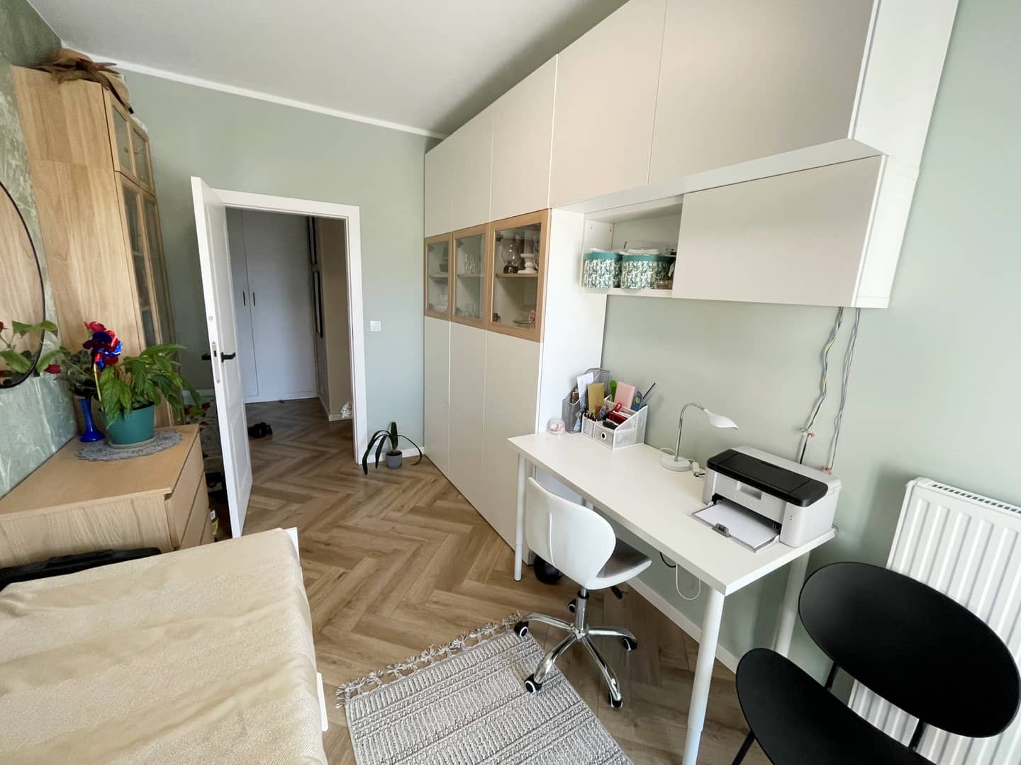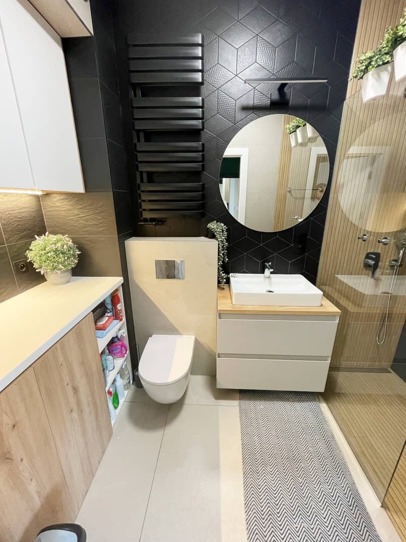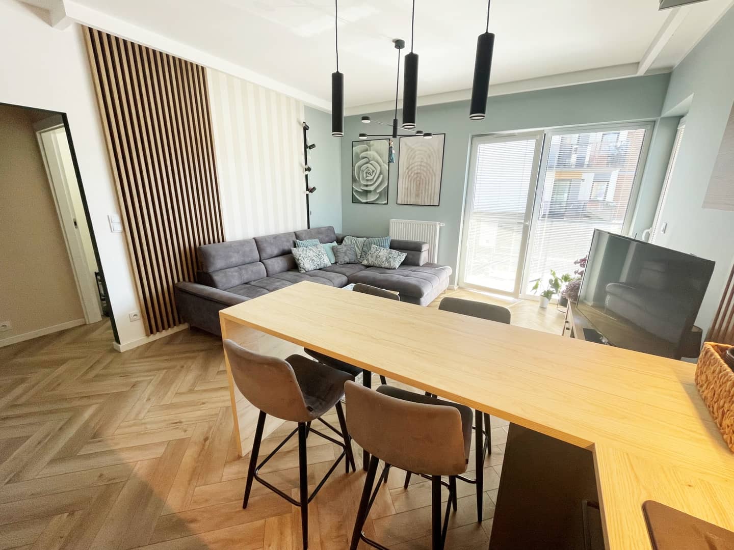 Na podłogach panele winylowe (imitujące deskę), na ścianach gładzie, tapety i dekoracyjne lamele. Większość umeblowania - w zabudowie (łącznie ze spiżarnią w zabudowie), sprzęt AGD - wysokiej jakości (m.in. piekarnik z pyrolizą), oświetlenie z regulacją barwy, dodatkowe: ledy posufitowe i podszafkowe.