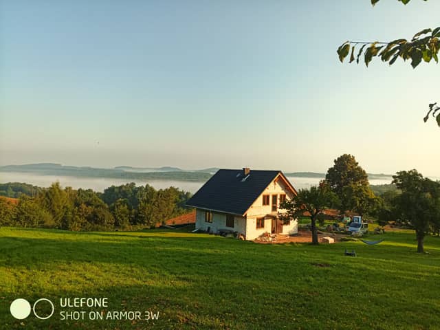 Posiada tynki, posadzki, elektrykę, ogrzewanie podłogowe, pompę ciepła.