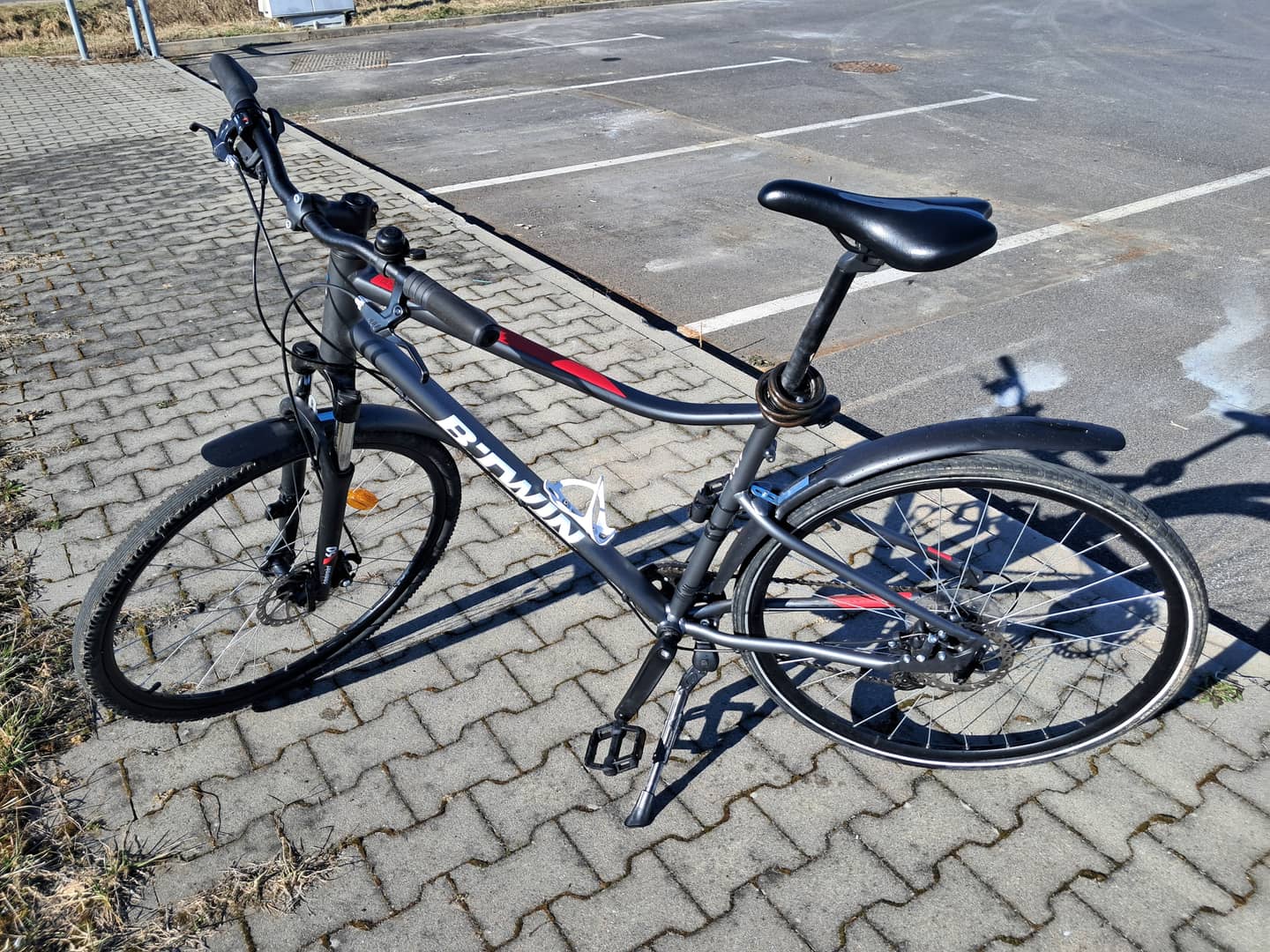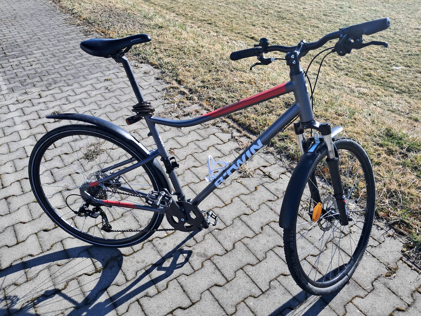 Witam, sprzedam rower trekingowy B'twin Riverside 500, rozmiar L. Aluminiowa rama, hamulce tarczowe, kaseta 9-rzędowa, amortyzator przedni, koła 28'', błotniki, nóżka, kolor szaro-czerwony. Cena 500zł.