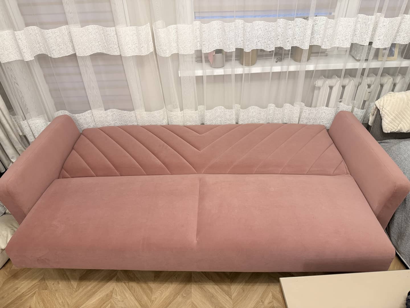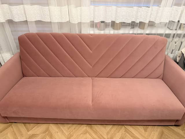 Wygodna i stylowa sofa w bardzo dobrym stanie. Posiada charakterystyczne pikowanie na oparciu, które dodaje jej elegancji. Mebel może stanowić ciekawy element aranżacji salonu lub sypialni.