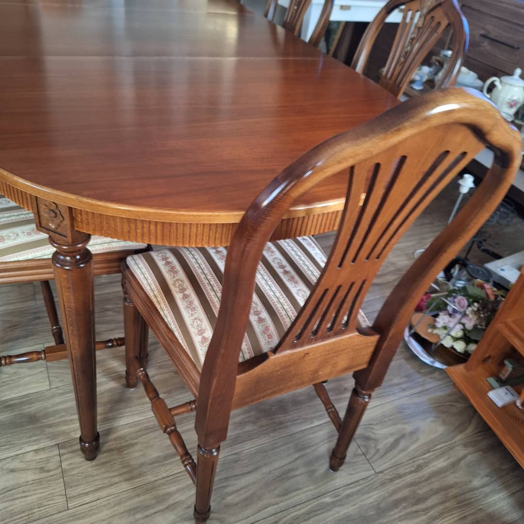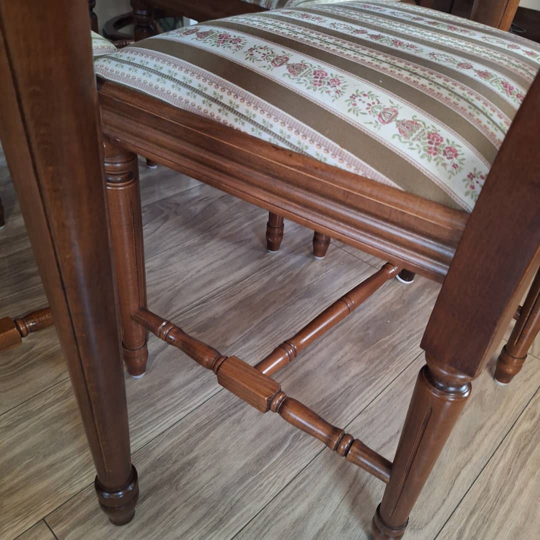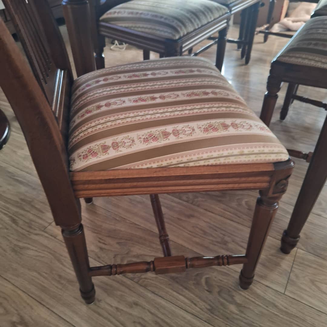 Piękny komplet stół i 6 krzeseł, owalny, drewniany, rozkładany 2 wstawkami. Przed rozłożeniem ma 140 cm, z jedną wstawką 190 cm, z dwiema 240 cm. Bez wad i uszczerbień, krzesła mają piękne obicia, czyste, nie rozchwiane, wygodne. Możliwy transport, cena za komplet 2000 zł do negocjacji.