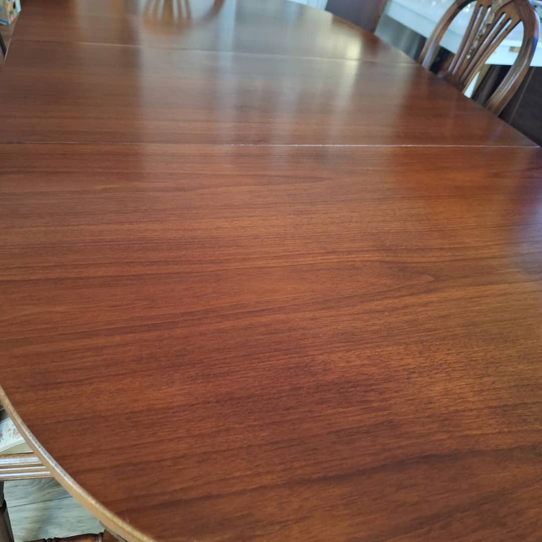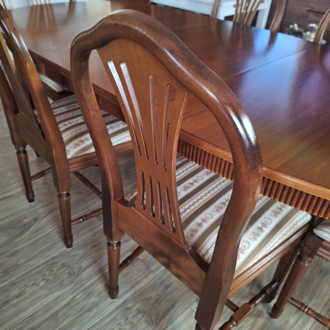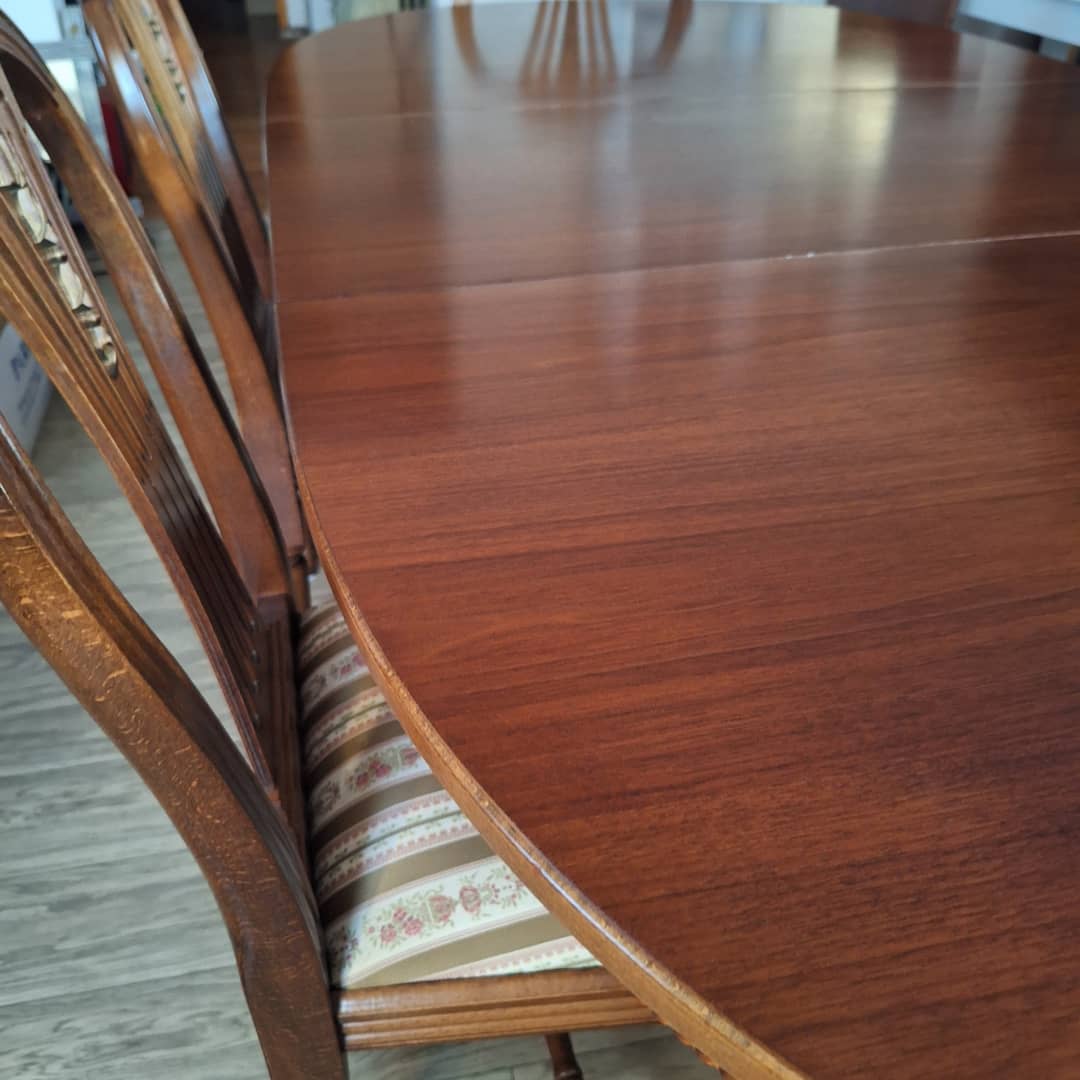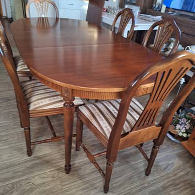 Piękny komplet stół i 6 krzeseł, owalny, drewniany, rozkładany 2 wstawkami. Przed rozłożeniem ma 140 cm, z jedną wstawką 190 cm, z dwiema 240 cm. Bez wad i uszczerbień, krzesła mają piękne obicia, czyste, nie rozchwiane, wygodne. Możliwy transport, cena za komplet 2000 zł do negocjacji.