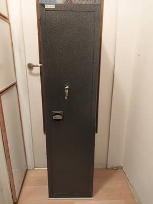 Szafa metalowa do przechowywania broni. Wewnątrz posiada komorę do przechowywania do 4 jednostek broni długiej i amunicji, posiada mocowanie do ściany i podłogi oraz 2 klucze i certyfikat. Wymiary: 150x39x28 cm. Cena 1500 PLN.