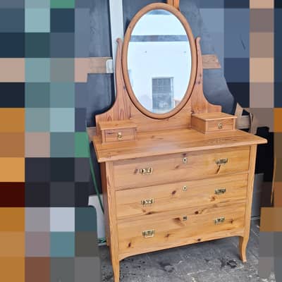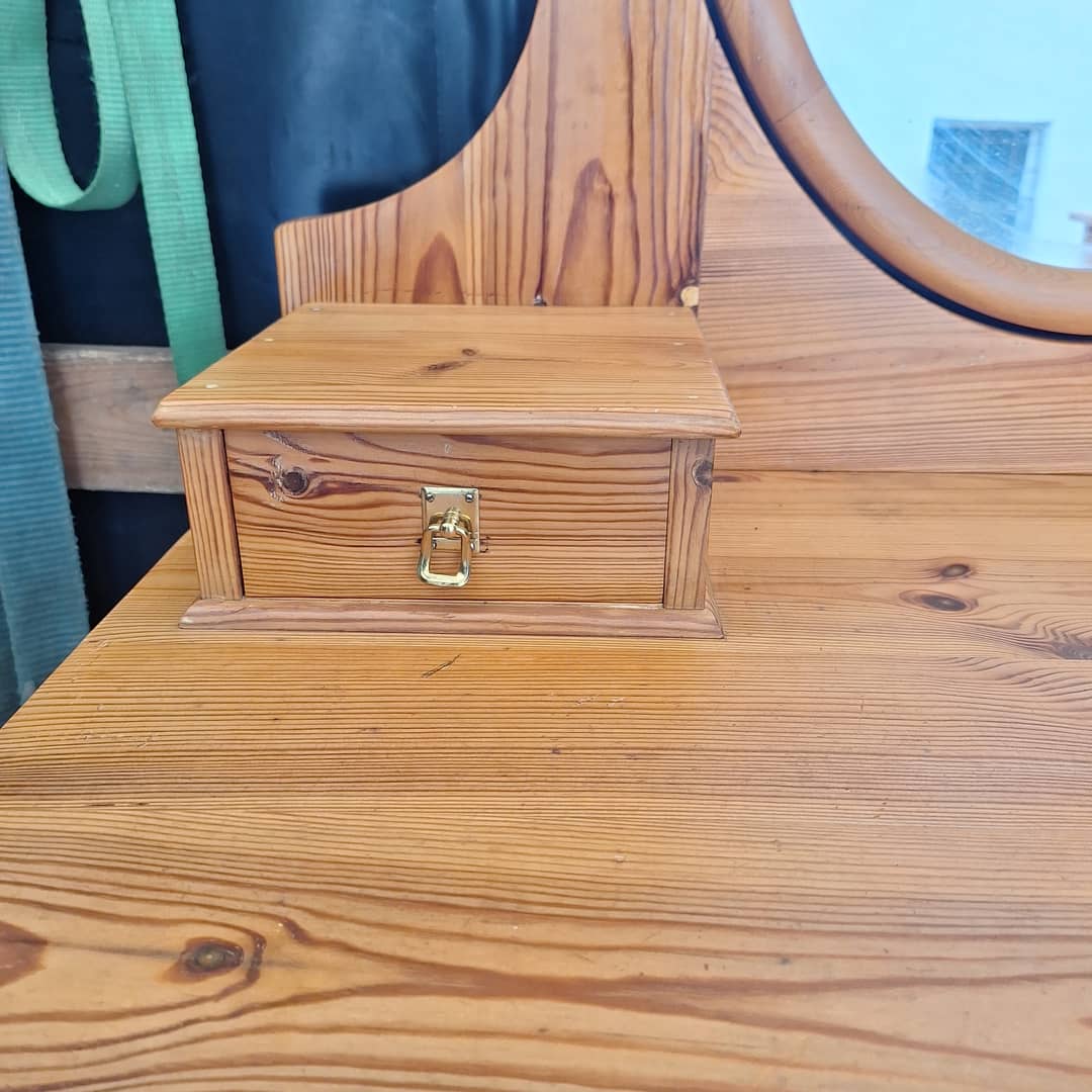 Toaletka z lustrem, drewno sosnowe, wymiary długość 76 cm, głębokość 41,5 cm, wysokość całkowita 159 cm, wysokość do blatu 103 cm. Możliwy transport. Cena 450 zł.