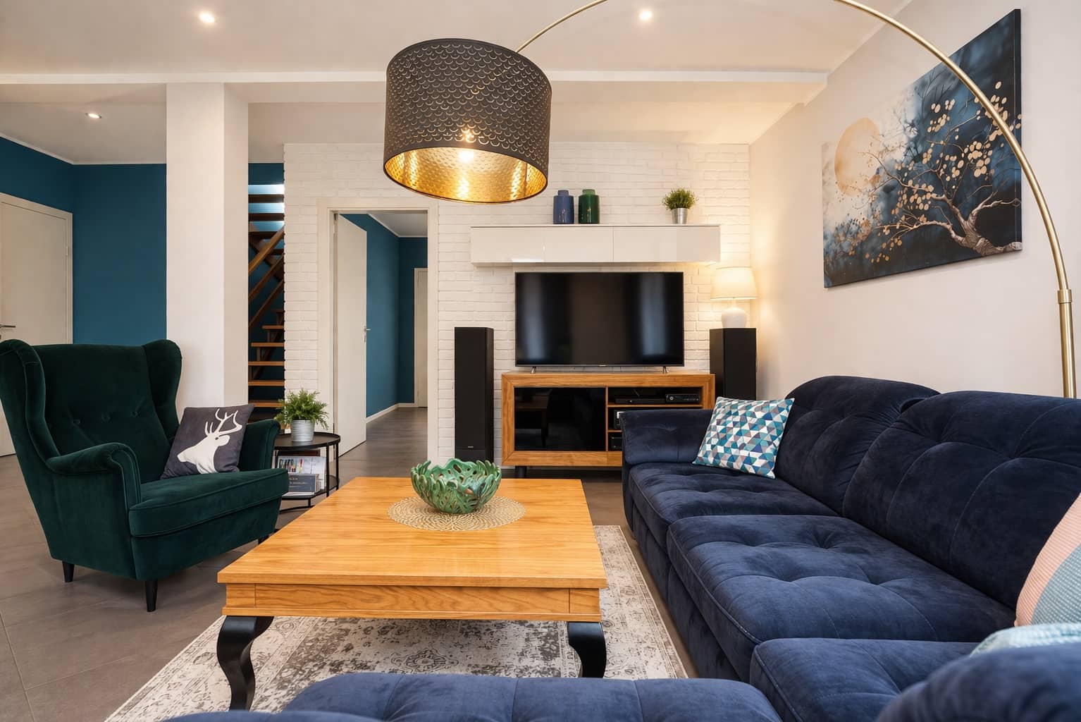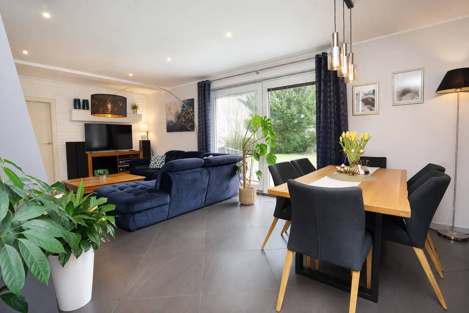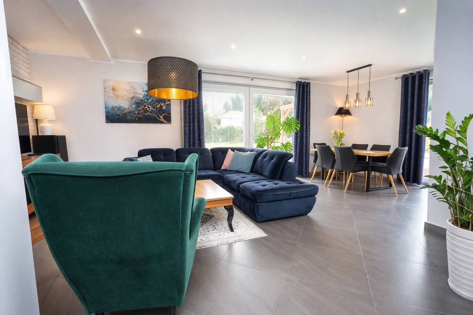 Wnętrza są jasne, nowoczesne i spójne stylistycznie, tworząc przyjazną przestrzeń do życia.