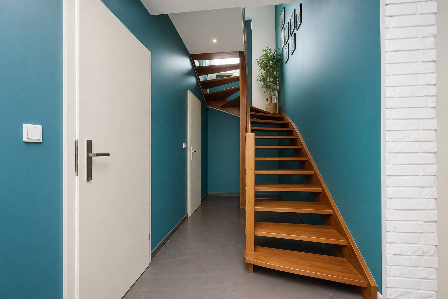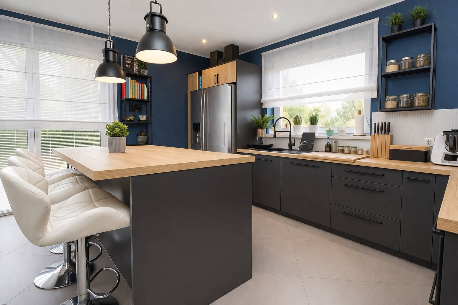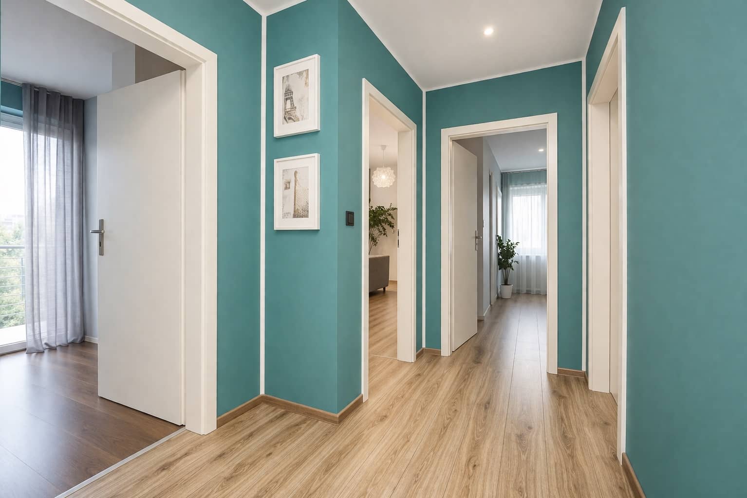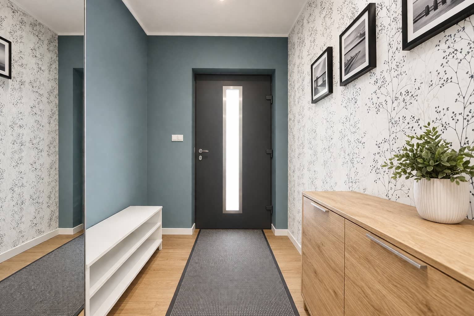 Wnętrza są jasne, nowoczesne i spójne stylistycznie, tworząc przyjazną przestrzeń do życia.