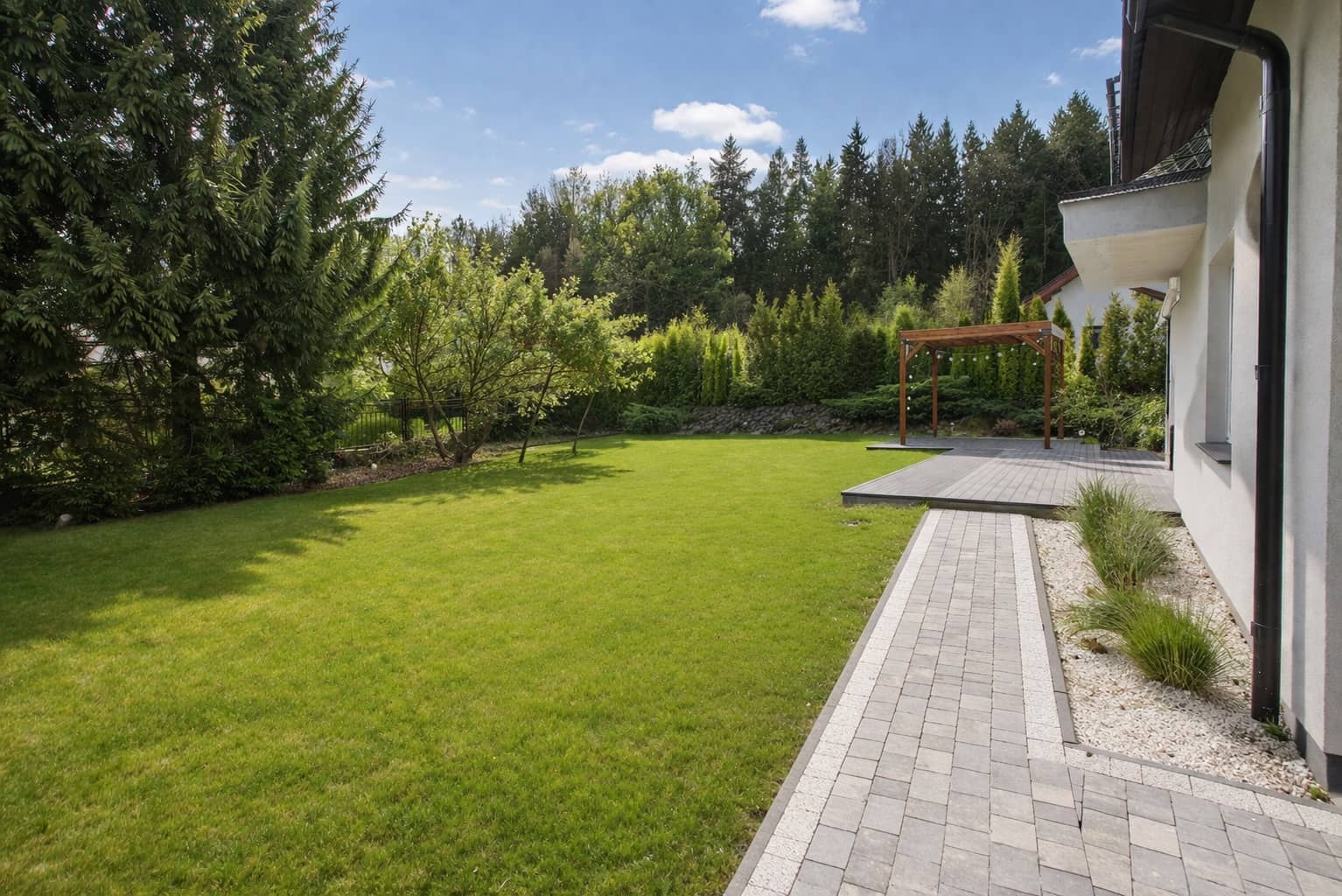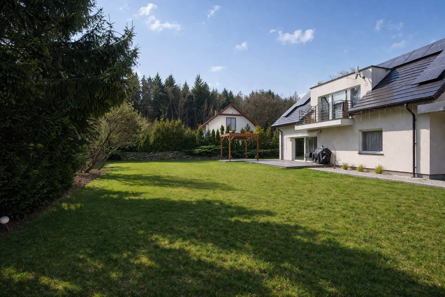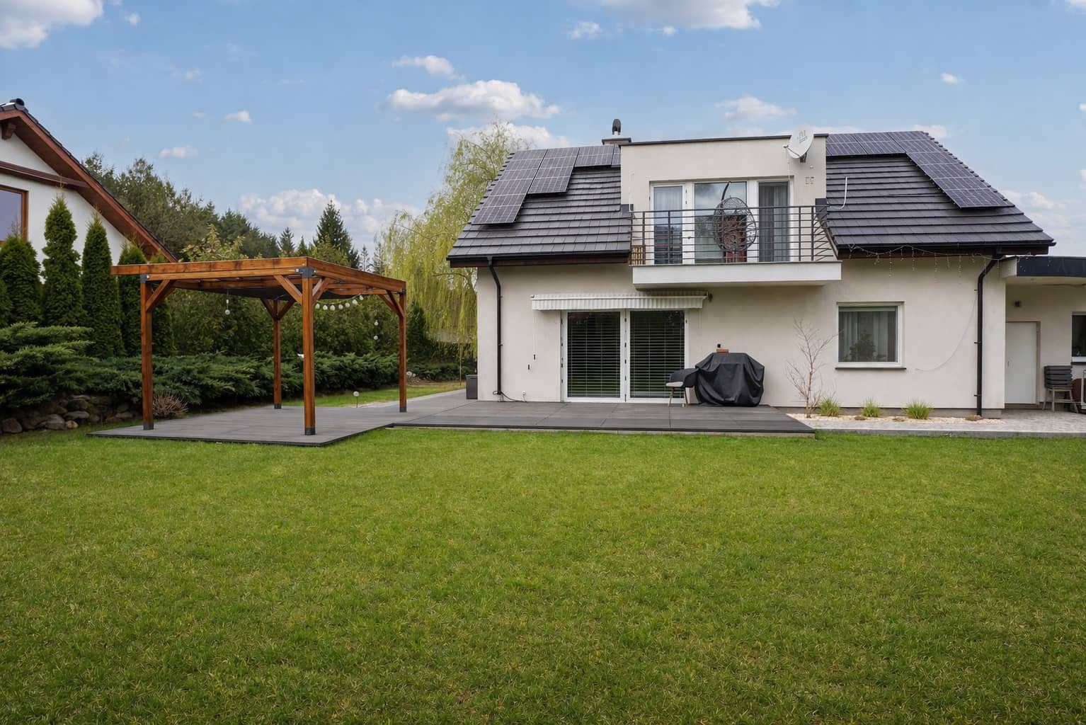 Nieruchomość wyróżnia się doskonale zagospodarowaną przestrzenią zewnętrzną: