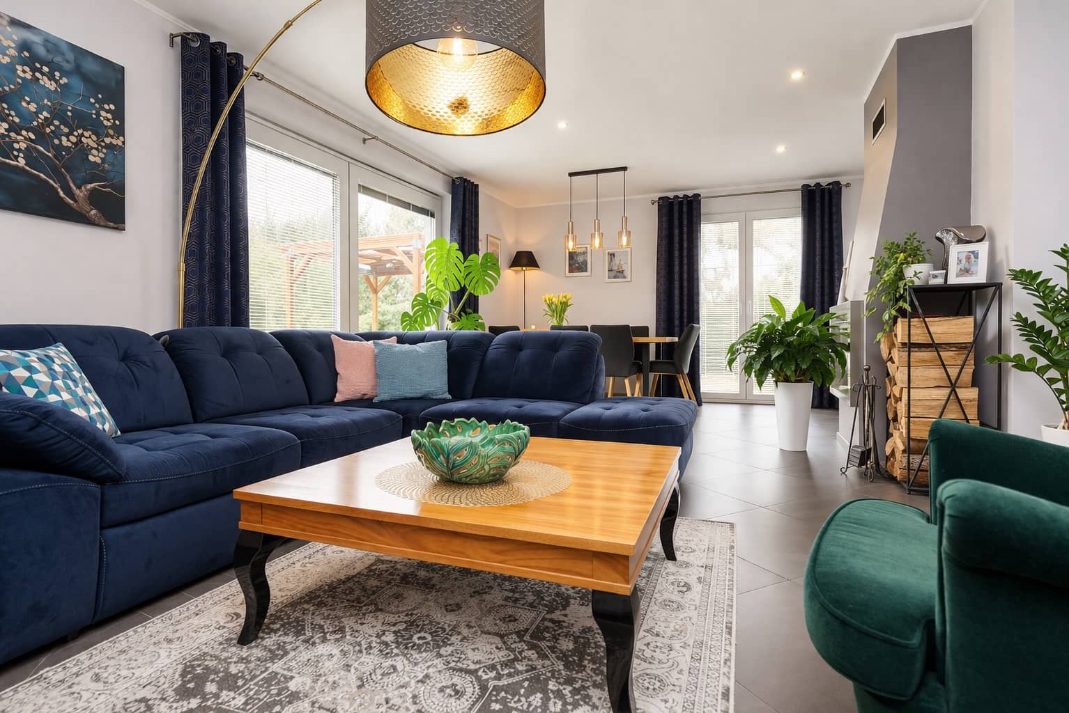 przestronny salon z jadalnią, kominkiem oraz wyjściem na taras