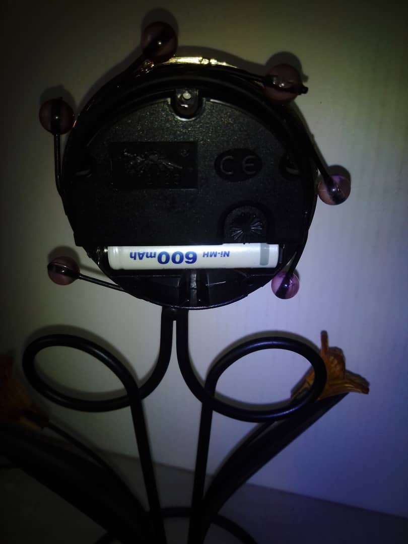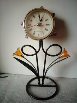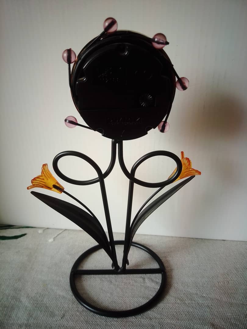Sprzedam zegar dekoracyjny w stylu metaloplastyki. Można go postawić na komodzie, stole, stoliku itp. Zegar jest umieszczony na podstawie w kształcie kwiatu. Zasilany akumulatorkiem Ni-HM typ AAA Camelion 600 mAh. Niewielkie ślady użytkowania. 20 zł.
